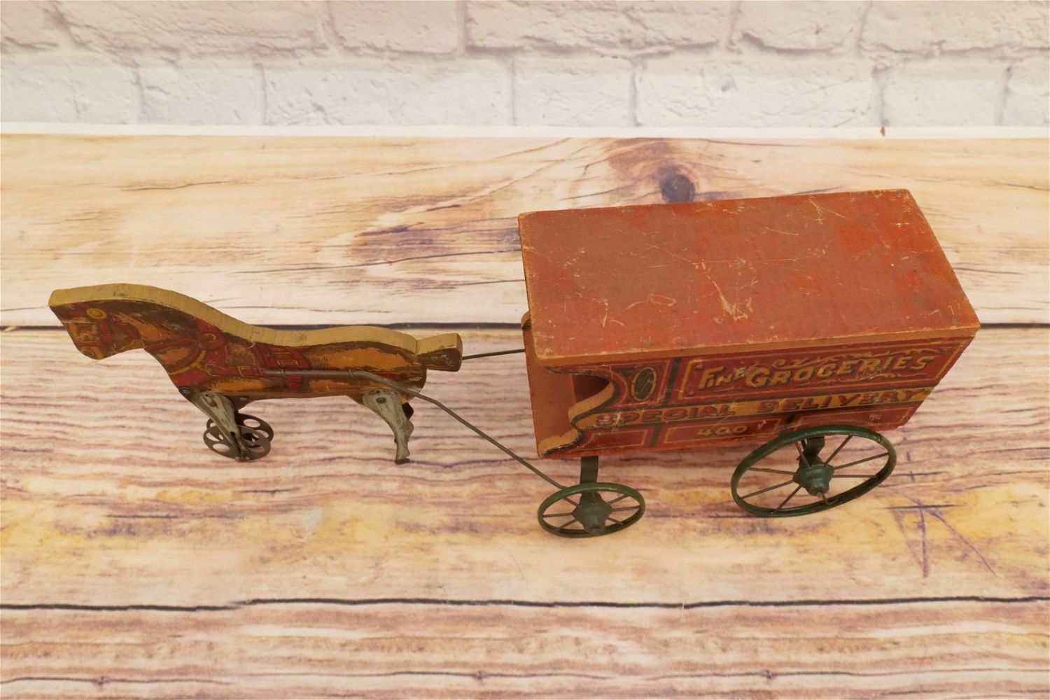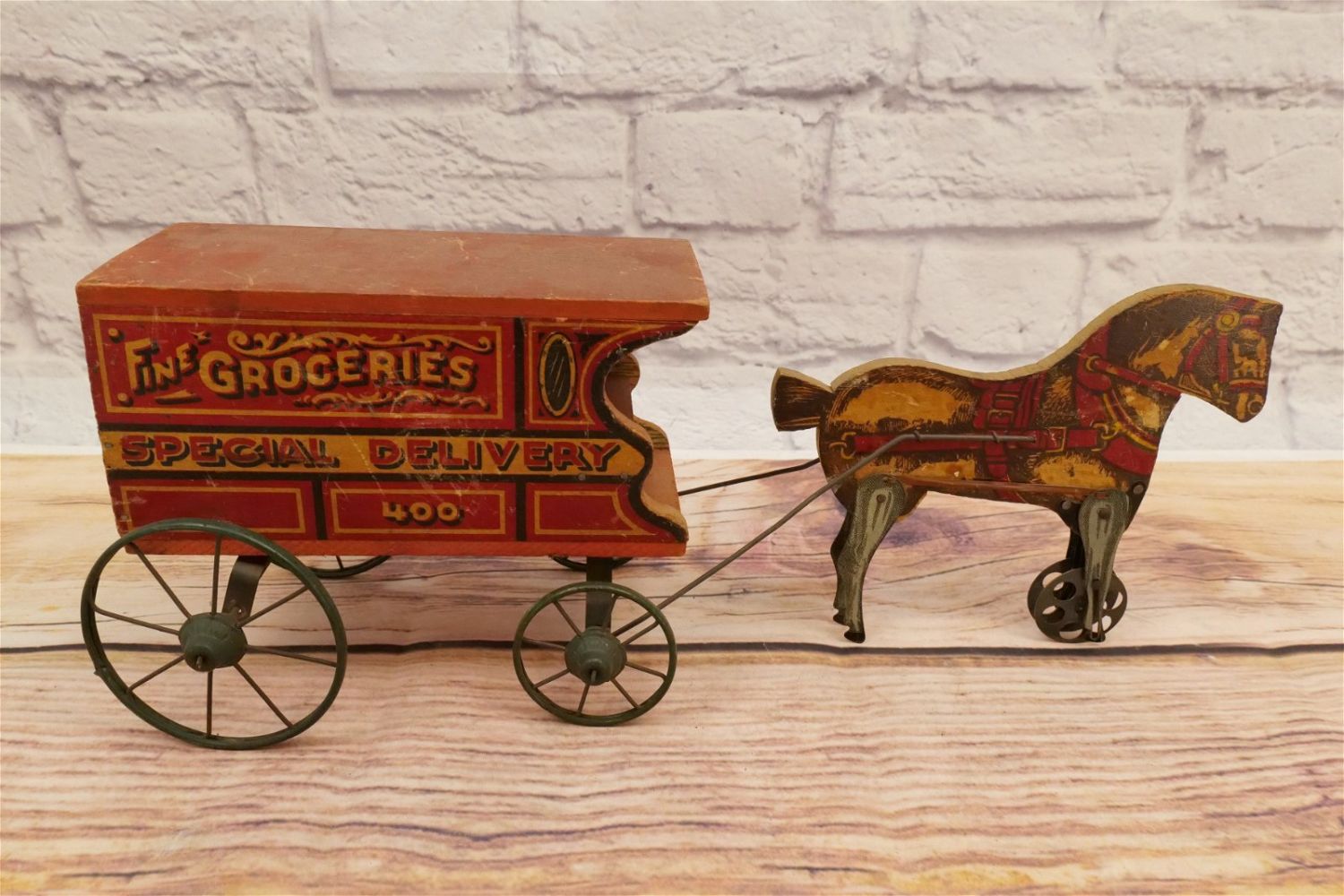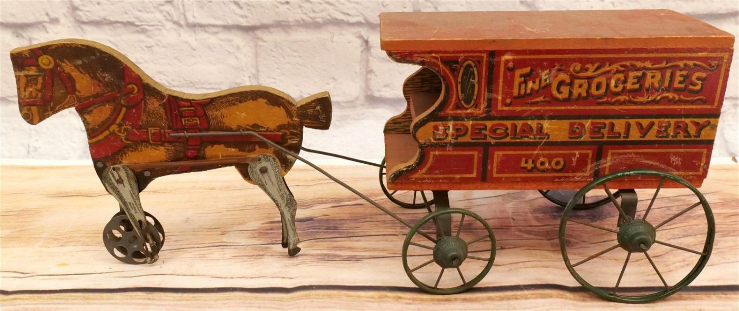 Vintage Horse Drawn Toy Wagon. Fine Groceries Special Delivery 400. Has functional moving horse legs. Has wear and scratching throughout. Measures 17" long x 5" wide. All invoices must be paid within 24 hours of the sale. We offer multiple shipping options, please read the terms as they have changed. We also offer Pick-Ups Friday, Saturday, and Monday immediately following the sale. BY APPOINTMENT ONLY. PLEASE READ THE SHIPPING TERMS!