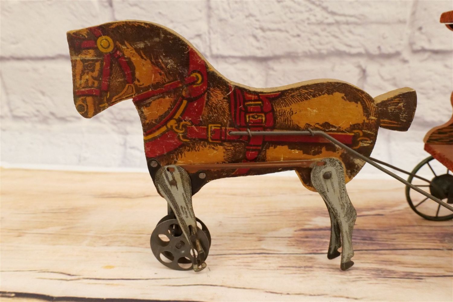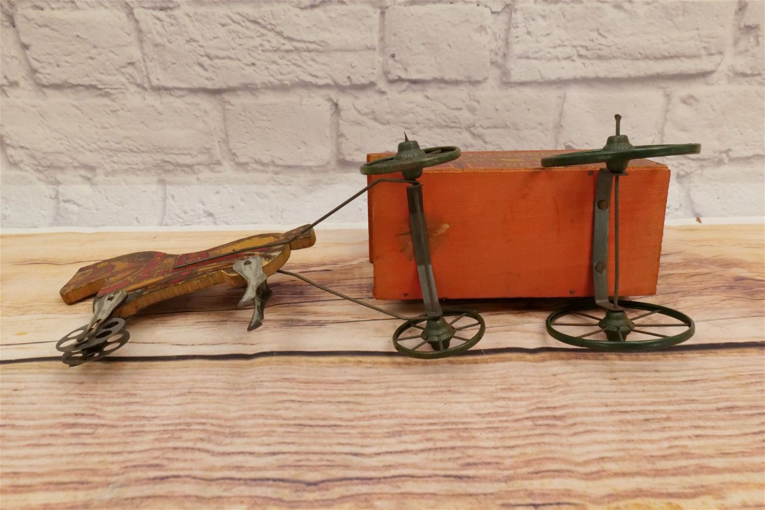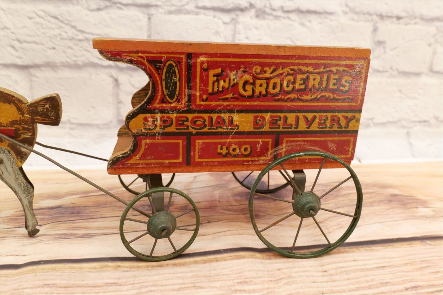 Vintage Horse Drawn Toy Wagon. Fine Groceries Special Delivery 400. Has functional moving horse legs. Has wear and scratching throughout. Measures 17" long x 5" wide. All invoices must be paid within 24 hours of the sale. We offer multiple shipping options, please read the terms as they have changed. We also offer Pick-Ups Friday, Saturday, and Monday immediately following the sale. BY APPOINTMENT ONLY. PLEASE READ THE SHIPPING TERMS!