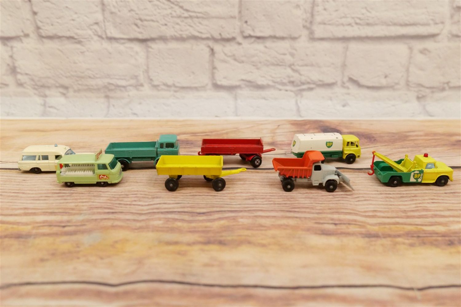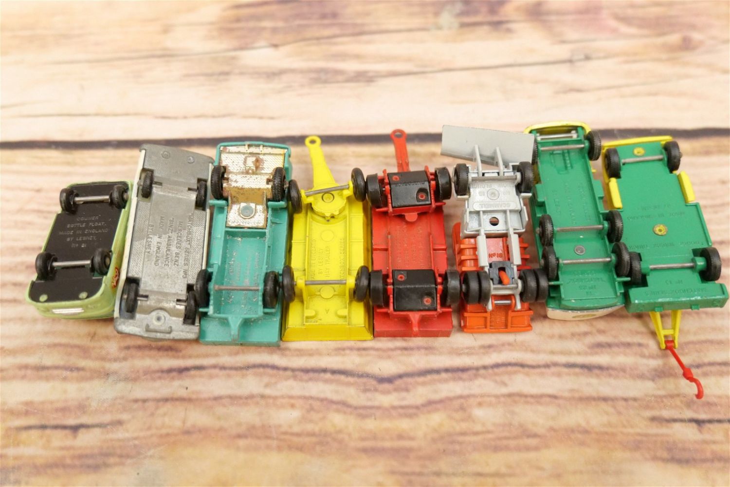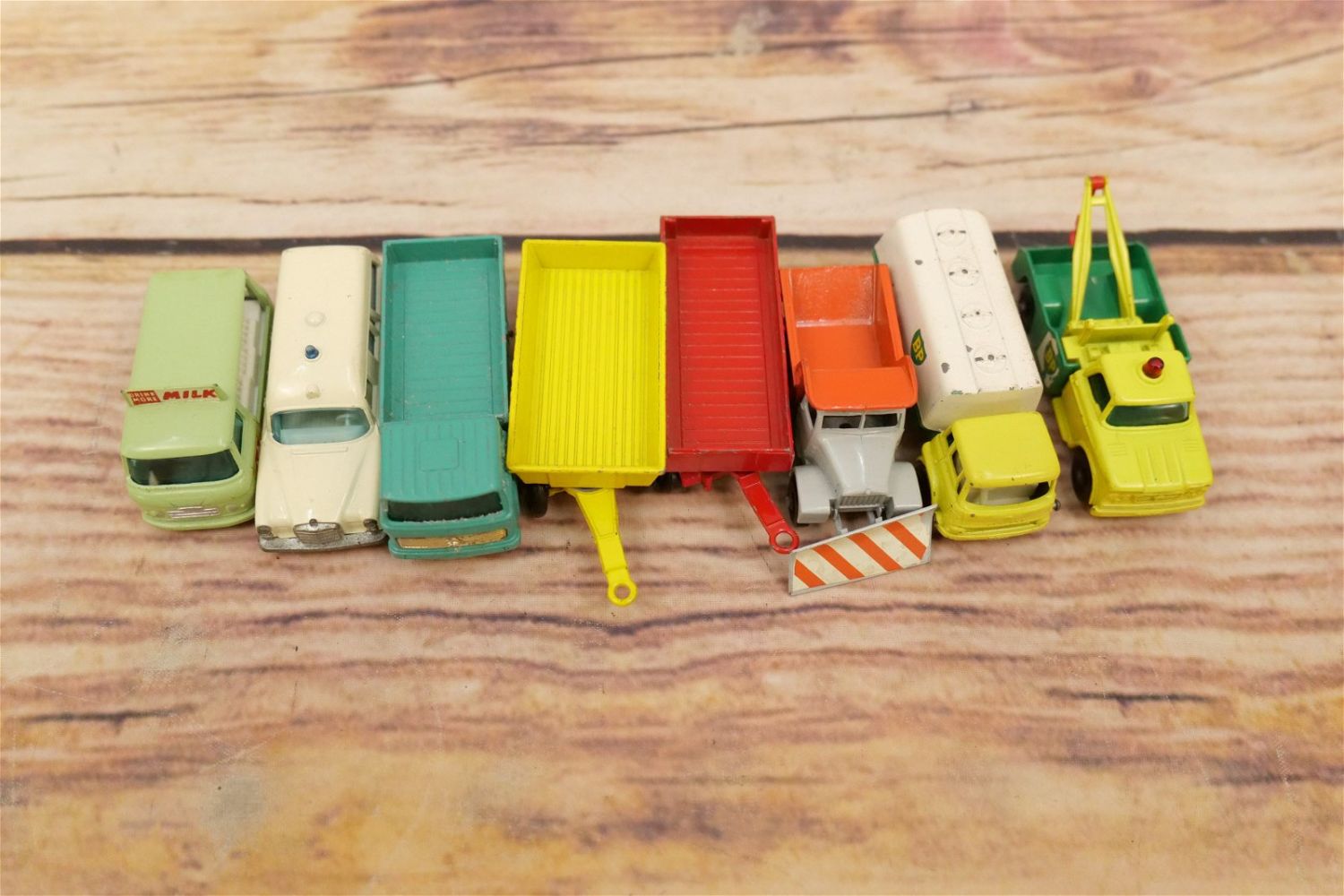 Group Lot of 8 Vintage Lesney Matchbox Cars including Commer Bottle Float No. 21, Mercedes Benz Binz Ambulance No. 3, Scammell Snow Plow No. 16, Mercedes Trailer in Red and Yellow, BP Petrol Tanker No. 25, BP Dodge Wrecker Truck No. 13, and Mercedes Truck No. 1. All in good to excellent condition. All invoices must be paid within 24 hours of the sale. We offer multiple shipping options, please read the terms as they have changed. We also offer Pick-Ups Friday, Saturday, and Monday immediately following the sale. BY APPOINTMENT ONLY. PLEASE READ THE SHIPPING TERMS!