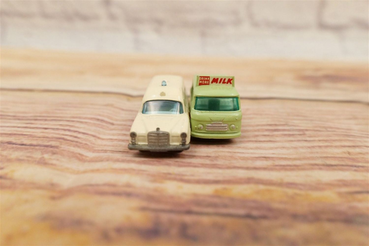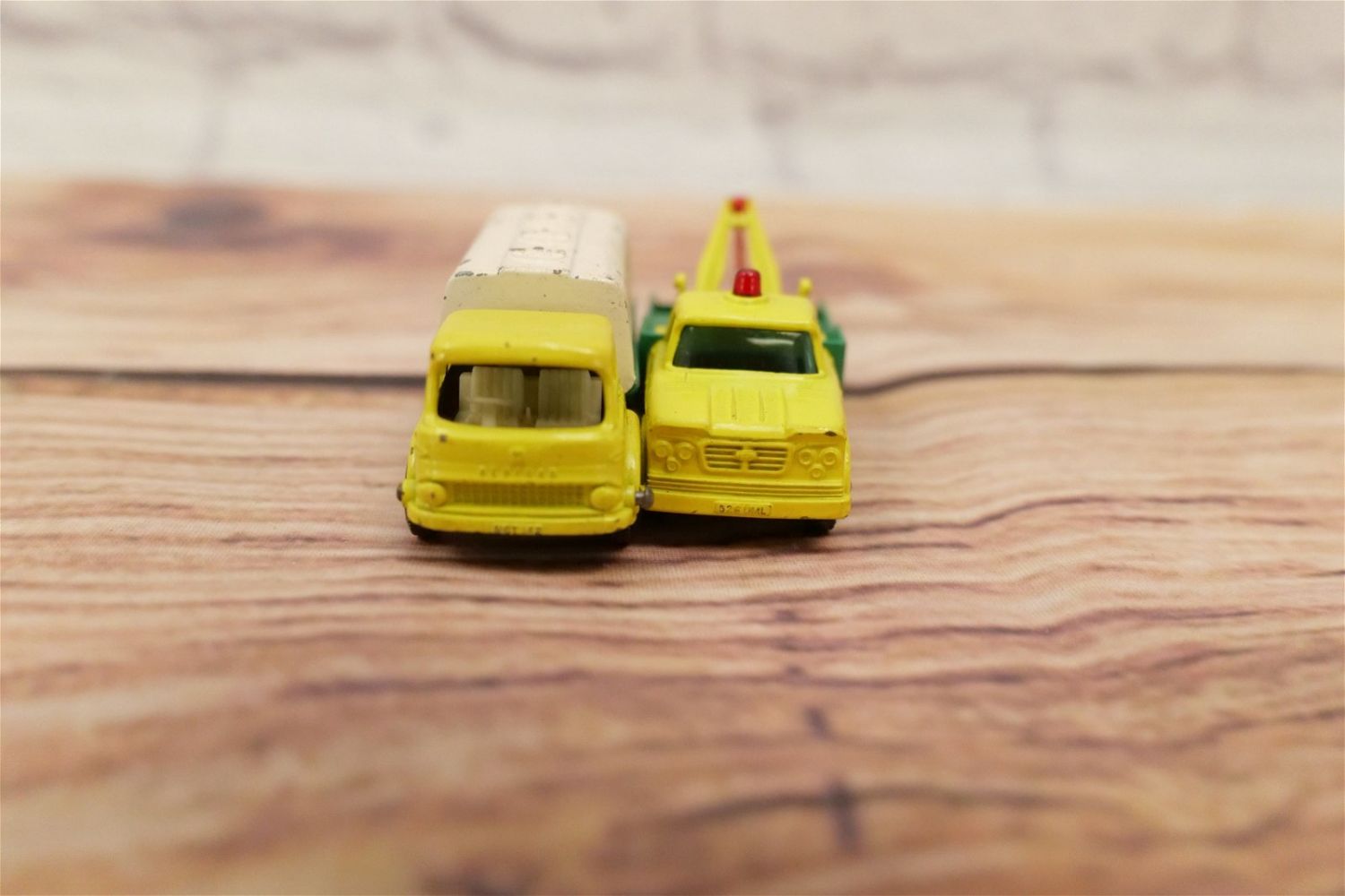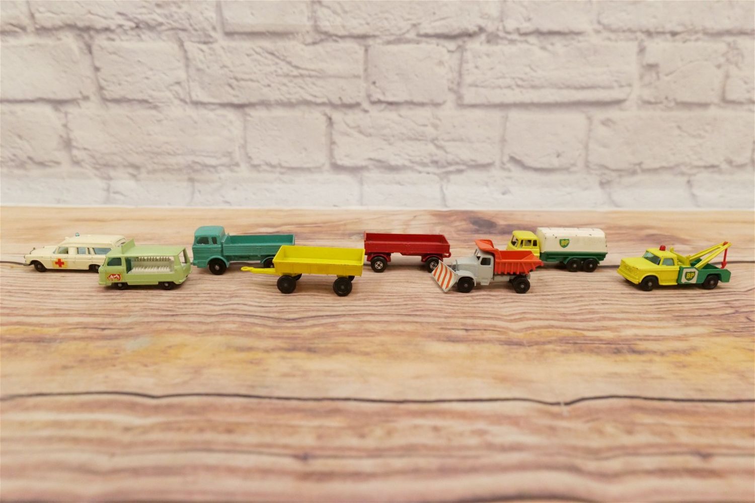 Group Lot of 8 Vintage Lesney Matchbox Cars including Commer Bottle Float No. 21, Mercedes Benz Binz Ambulance No. 3, Scammell Snow Plow No. 16, Mercedes Trailer in Red and Yellow, BP Petrol Tanker No. 25, BP Dodge Wrecker Truck No. 13, and Mercedes Truck No. 1. All in good to excellent condition. All invoices must be paid within 24 hours of the sale. We offer multiple shipping options, please read the terms as they have changed. We also offer Pick-Ups Friday, Saturday, and Monday immediately following the sale. BY APPOINTMENT ONLY. PLEASE READ THE SHIPPING TERMS!