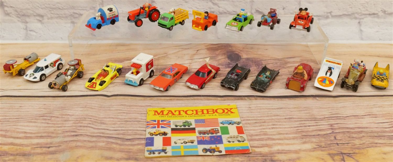 Lot of 20 Vintage Diecast Vehicles including United Feature Syndicate Peanuts Set, Corgi Barney Rubble, Whiz Wheels, Corgi Penguin, Walt Disney Productions Cars and More. In poor to good condition. Also includes vintage Matchbook pamphlet. All invoices must be paid within 24 hours of the sale. We offer multiple shipping options, please read the terms as they have changed. We also offer Pick-Ups Friday, Saturday, and Monday immediately following the sale. BY APPOINTMENT ONLY. PLEASE READ THE SHIPPING TERMS!