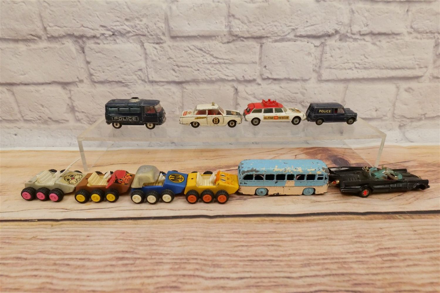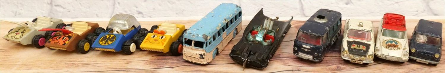 Lot of 10 Vintage Diecast Vehicles including Corgi Batmobile – Missing 2 Wheels, Corgi Citroen, Buddy L and More. Missing many parts, damaged windshields, etc. In poor to fair condition. All invoices must be paid within 24 hours of the sale. We offer multiple shipping options, please read the terms as they have changed. We also offer Pick-Ups Friday, Saturday, and Monday immediately following the sale. BY APPOINTMENT ONLY. PLEASE READ THE SHIPPING TERMS!