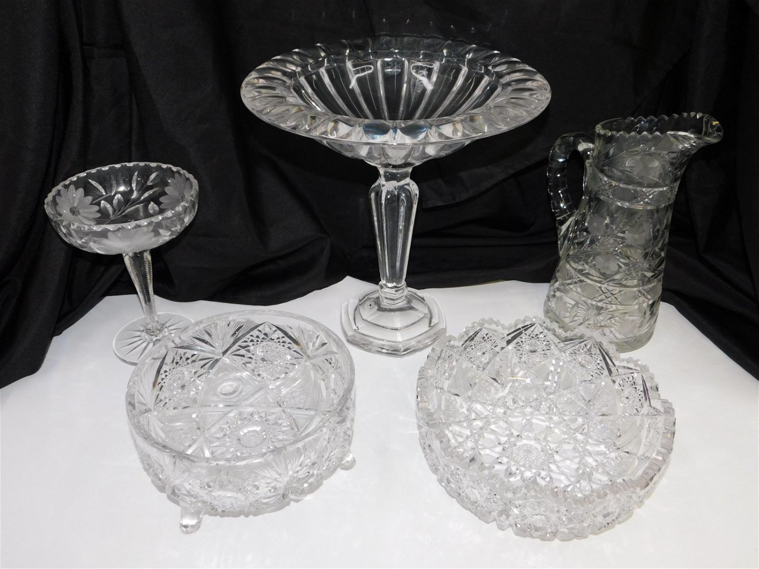 Lot of Cut Glass Items including Cut Glass Pitcher, Brilliant Cut Center Bowl, Cut Glass Compote, Footed Bowl, and Lead Glass German Compote. Minor fleabites on several pieces Largest piece measures 12.5" tall x 12" wide. All invoices must be paid within 24 hours of the sale. Shipping options are the Liveaship from liveauctionners as seen on the listing, in-house shipping on small lots, and the local UPS Store. Liveship is only one option. Please see shipping terms for all options. Local pickups are at our Monmouth Junction location on Friday, Saturday and Monday ONLY! All pickups are by appointment only. Any condition issues will be listed in the description. Please read the terms for full information.
