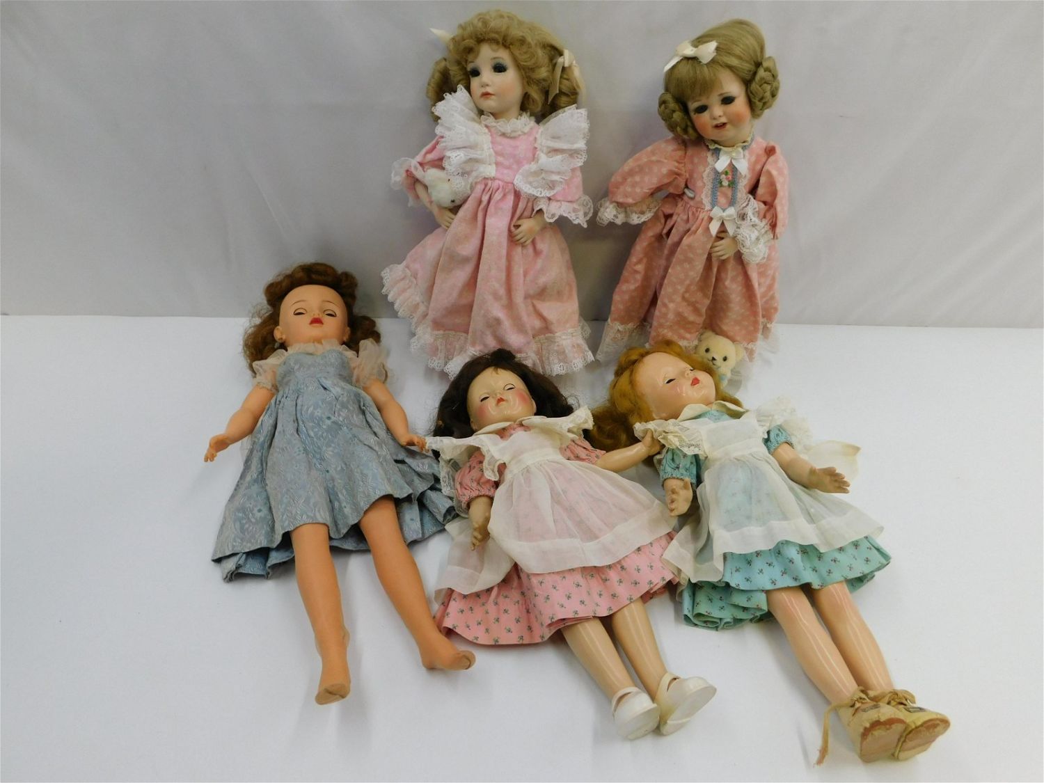 Lot of Vintage and New Dolls. Including Ideal Composition P-90, Ideal Vinyl Doll VT-20, Effanbee Composition Doll, and 2 Newer Porcelain Dolls. Largest Doll measures 19" long. All invoices must be paid within 24 hours of the sale. Shipping options are the Liveaship from liveauctionners as seen on the listing, in-house shipping on small lots, and the local UPS Store. Liveship is only one option. Please see shipping terms for all options. Local pickups are at our Monmouth Junction location on Friday, Saturday and Monday ONLY! All pickups are by appointment only. Any condition issues will be listed in the description. Please read the terms for full information.
