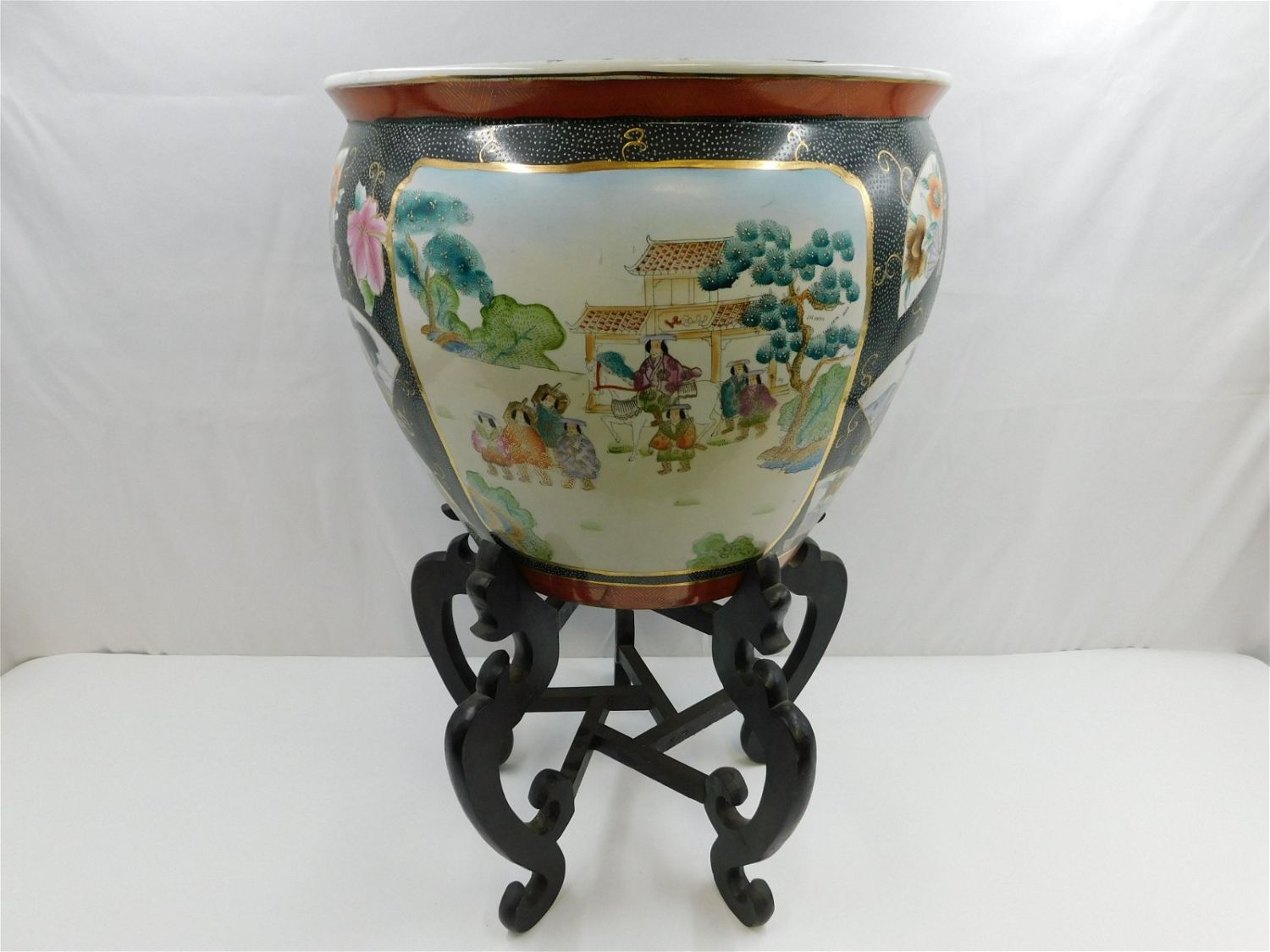Oversized Chinese Porcelain Planter with Wood Stand. Asian Scenes. Planter without stands 17" tall x 22" diameter. Measures All invoices must be paid within 24 hours of the sale. Shipping options are the Liveaship from liveauctionners as seen on the listing, in-house shipping on small lots, and the local UPS Store. Liveship is only one option. Please see shipping terms for all options. Local pickups are at our Monmouth Junction location on Friday, Saturday and Monday ONLY! All pickups are by appointment only. Any condition issues will be listed in the description. Please read the terms for full information.