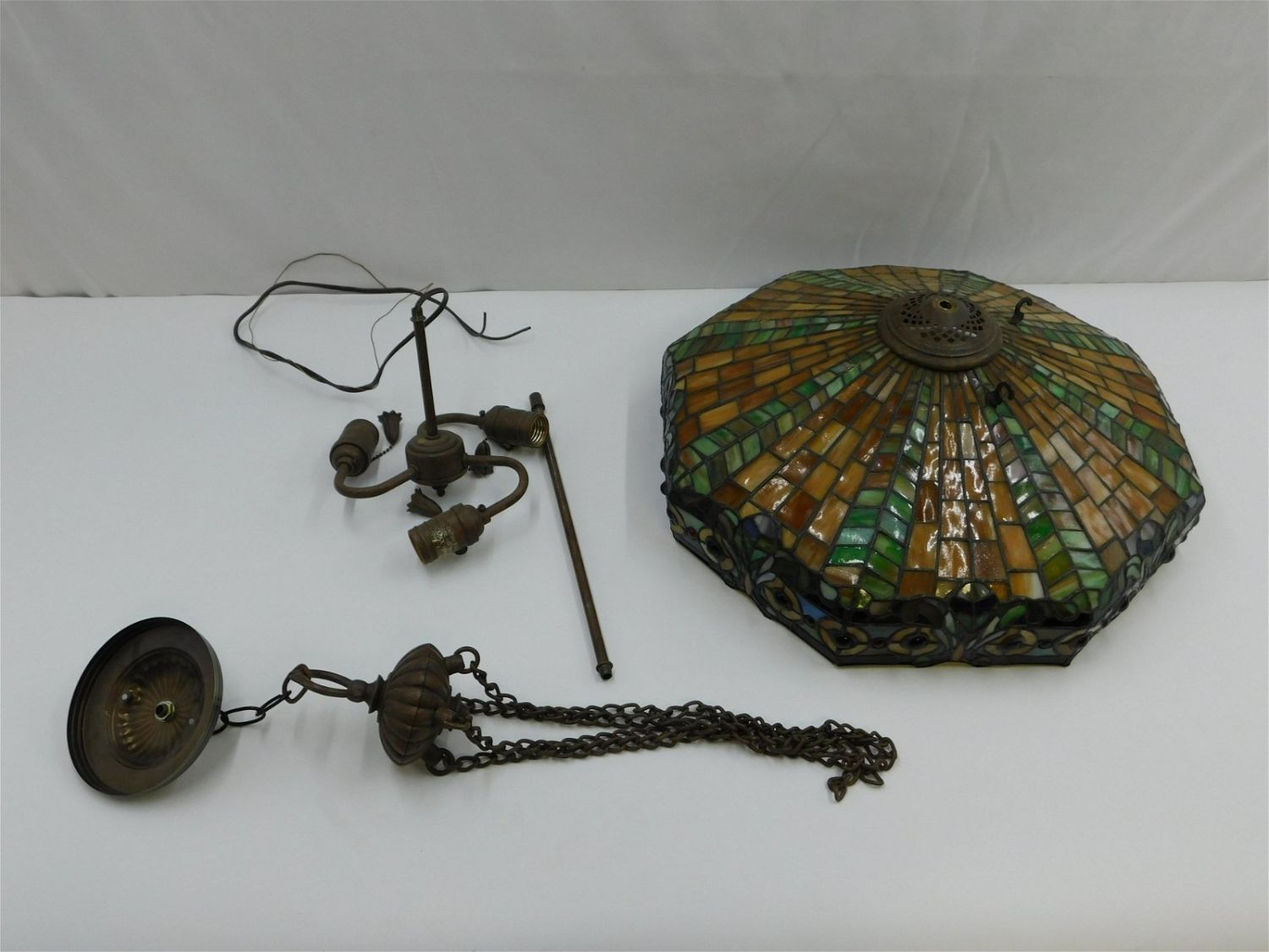 Leaded Glass Tiffany Style Hanging Chandelier. Signed Kichler. Missing 2 hooks on leaded glass to hang. Overall Quality Shape. Measures 20" diameter. All invoices must be paid within 24 hours of the sale. Shipping options are the Liveaship from liveauctionners as seen on the listing, in-house shipping on small lots, and the local UPS Store. Liveship is only one option. Please see shipping terms for all options. Local pickups are at our Monmouth Junction location on Friday, Saturday and Monday ONLY! All pickups are by appointment only. Any condition issues will be listed in the description. Please read the terms for full information.