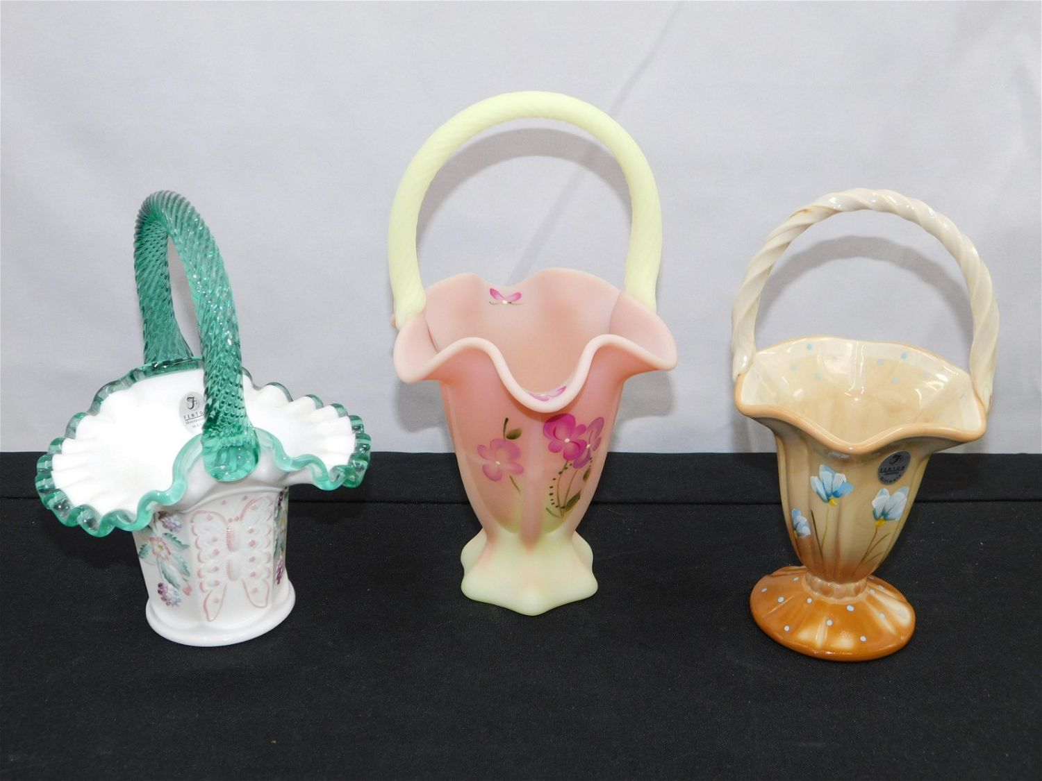 Lot of 3 Hand Painted Fenton Baskets including Satin Glass with Flowers – Has chip and crack near basket handle – See Photo, Encased Glass with Butterfly and Blackberry Flower, and Custard Glass with Flower Design. All are artist signed. One comes with box. Largest measures 8.5" tall x 5" wide. All invoices must be paid within 24 hours of the sale. Shipping options are the Liveaship from liveauctionners as seen on the listing, in-house shipping on small lots, and the local UPS Store. Liveship is only one option. Please see shipping terms for all options. Local pickups are at our Monmouth Junction location on Friday, Saturday and Monday ONLY! All pickups are by appointment only. Any condition issues will be listed in the description. Please read the terms for full information.