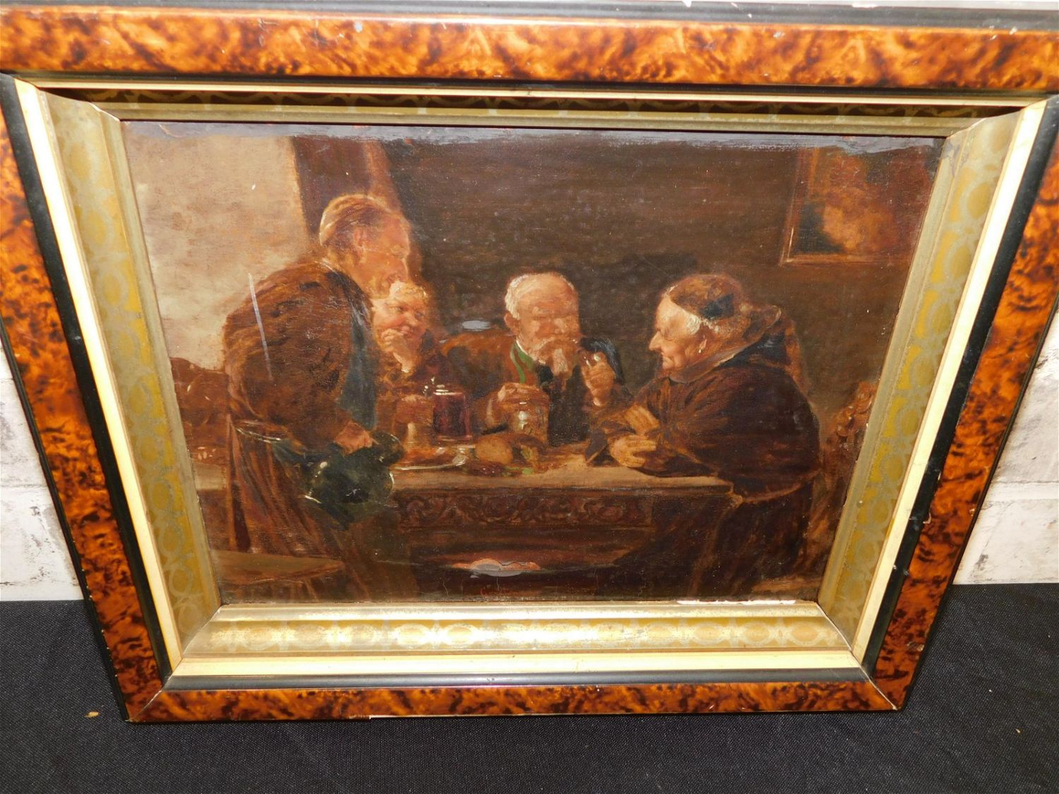 19th Century Oil on Wood Panel by Eduard Bon Grutzner (1846-1925). Depicting a monk and men seated at a dinner table. Signed lower center. Does have paint loss and chipping just above signature. Measures 11" tall x 13" wide. All invoices must be paid within 24 hours of the sale. Shipping options are the Liveaship from liveauctionners as seen on the listing, in-house shipping on small lots, and the local UPS Store. Liveship is only one option. Please see shipping terms for all options. Local pickups are at our Monmouth Junction location on Thursday, Friday, Saturday and Monday ONLY! All pickups are by appointment only. Any condition issues will be listed in the description. Please read the terms for full information.