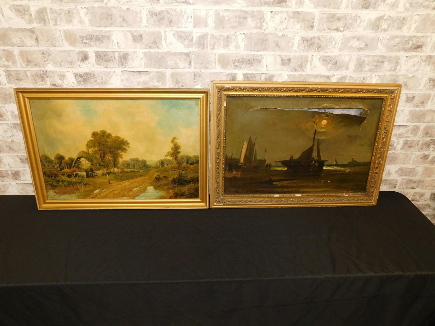 Lot of 2 Oil on Canvas – One depicting cottage scene – signed lower left – undetermined – cracking throughout with 2 tears and other by Webster depicting Night Scene with boats, lighthouse and full moon – signed lower right – has massive tears and holes and will need a full restoration. Largest measures 20" tall x 28" wide. All invoices must be paid within 24 hours of the sale. Shipping options are the Liveaship from liveauctionners as seen on the listing, in-house shipping on small lots, and the local UPS Store. Liveship is only one option. Please see shipping terms for all options. Local pickups are at our Monmouth Junction location on Thursday, Friday, Saturday and Monday ONLY! All pickups are by appointment only. Any condition issues will be listed in the description. Please read the terms for full information.
