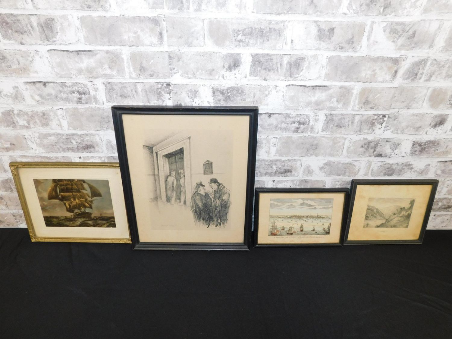 Lot of 4 Pieces of Art including Print by William Sharp (1900-1961) depicting Lawyer giving advice, Print of Sailing Ship – Unsigned, Drawing of Ruines D’ Ehren Fells – Unsigned, and Hand Colored Print depicting Boston. Largest measures 16.25" tall x 13.25" wide. All invoices must be paid within 24 hours of the sale. Shipping options are the Liveaship from liveauctionners as seen on the listing, in-house shipping on small lots, and the local UPS Store. Liveship is only one option. Please see shipping terms for all options. Local pickups are at our Monmouth Junction location on Thursday, Friday, Saturday and Monday ONLY! All pickups are by appointment only. Any condition issues will be listed in the description. Please read the terms for full information.