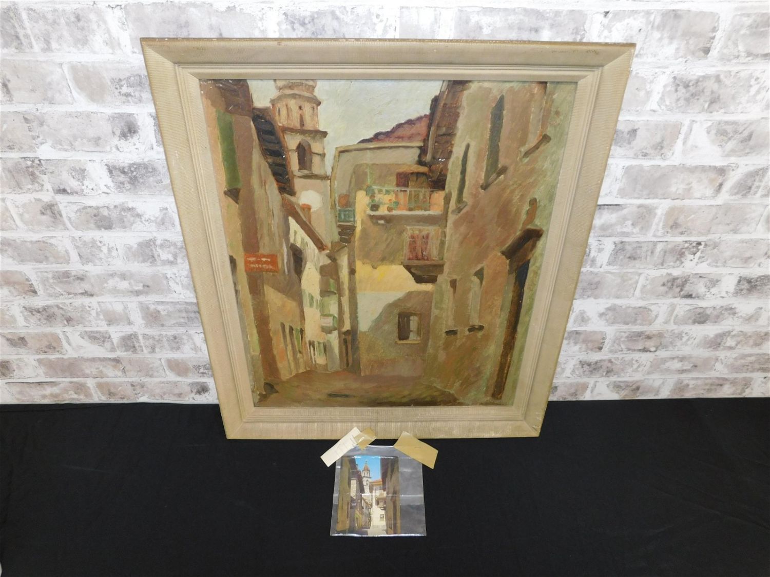 Oil on Board by Sepp Anderegg (1901-1952). Entitled "Ascona" Depicting European Street Scene. Signed lower right – Dated 1943. Minor paint loss. Measures 27.5" tall x 23" wide. All invoices must be paid within 24 hours of the sale. Shipping options are the Liveaship from liveauctionners as seen on the listing, in-house shipping on small lots, and the local UPS Store. Liveship is only one option. Please see shipping terms for all options. Local pickups are at our Monmouth Junction location on Thursday, Friday, Saturday and Monday ONLY! All pickups are by appointment only. Any condition issues will be listed in the description. Please read the terms for full information.