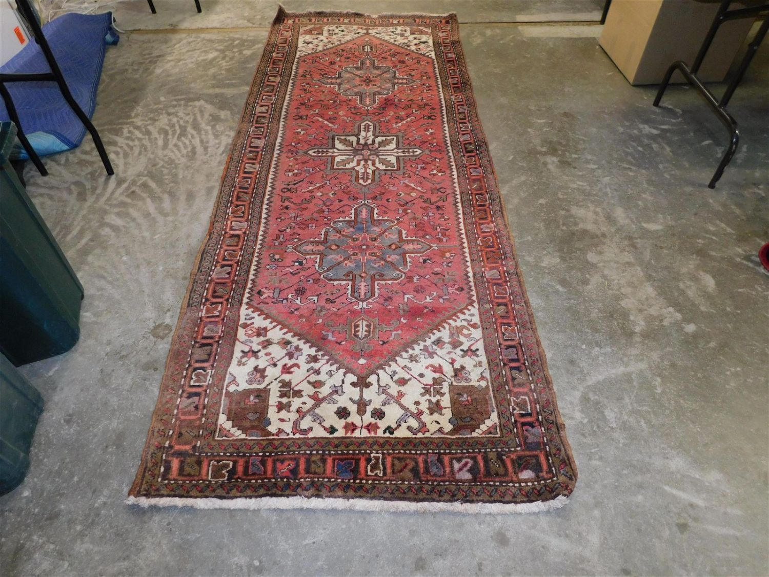 Handmade Semi-Antique Runner. Geometrical Design. Could use a cleaning. Has a little indentation at border. Measures 107" long x 42" wide. All invoices must be paid within 24 hours of the sale. Shipping options are the Liveaship from liveauctionners as seen on the listing, in-house shipping on small lots, and the local UPS Store. Liveship is only one option. Please see shipping terms for all options. Local pickups are at our Monmouth Junction location on Thursday, Friday, Saturday and Monday ONLY! All pickups are by appointment only. Any condition issues will be listed in the description. Please read the terms for full information.