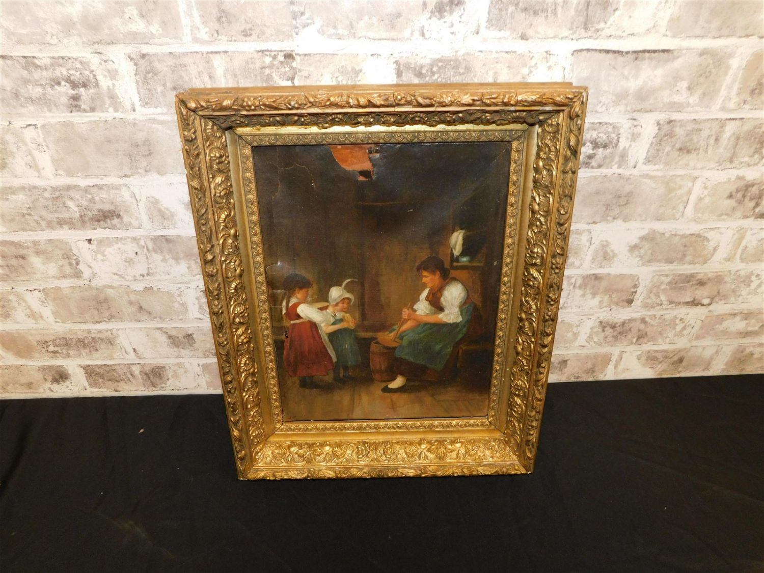 19th Century Oil on Canvas depicting Mother with Children Churning Butter. Signed lower left – Undetermined. Appears to be M. Gorman. Major damage to canvas – tears throughout. Needs to be restored. Measures 17" tall x 14". All invoices must be paid within 24 hours of the sale. Shipping options are the Liveaship from liveauctionners as seen on the listing, in-house shipping on small lots, and the local UPS Store. Liveship is only one option. Please see shipping terms for all options. Local pickups are at our Monmouth Junction location on Thursday, Friday, Saturday and Monday ONLY! All pickups are by appointment only. Any condition issues will be listed in the description. Please read the terms for full information.
