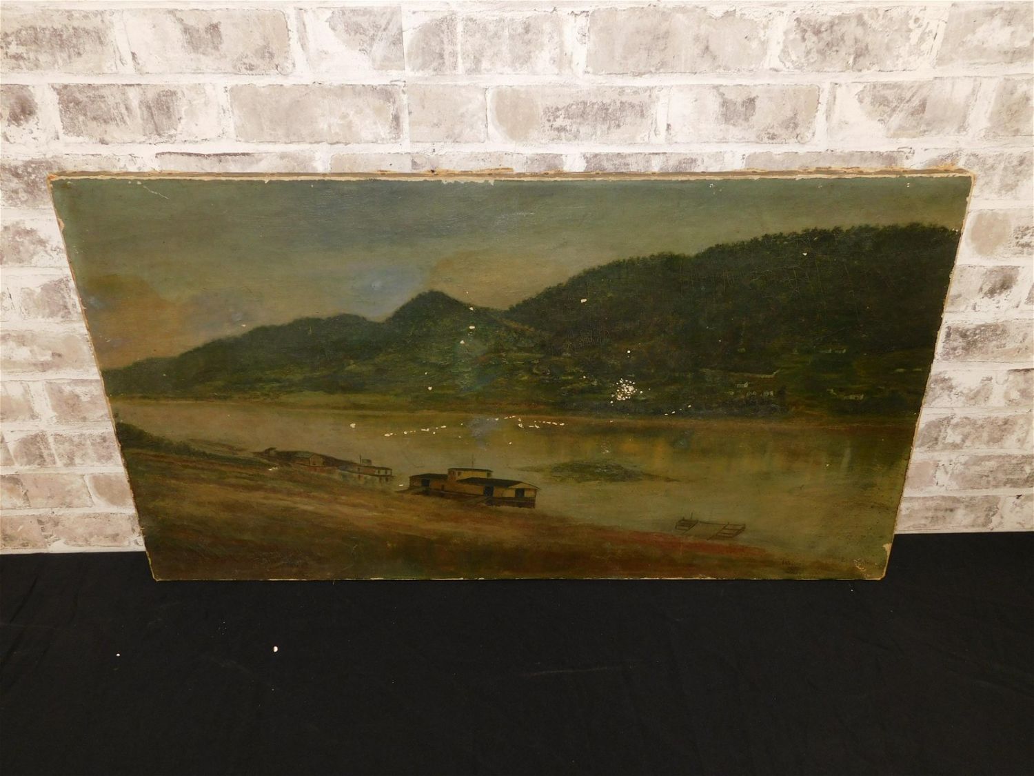 19th Century Oil on Canvas by Wilson. Depicting a River Scene with Barges and River Boat House with a Mountain in the Background. Has paint loss and some in painting. Two tears to canvas. One has been repaired. Signed lower right. Measures 20" tall x 36" wide. All invoices must be paid within 24 hours of the sale. Shipping options are the Liveaship from liveauctionners as seen on the listing, in-house shipping on small lots, and the local UPS Store. Liveship is only one option. Please see shipping terms for all options. Local pickups are at our Monmouth Junction location on Thursday, Friday, Saturday and Monday ONLY! All pickups are by appointment only. Any condition issues will be listed in the description. Please read the terms for full information.
