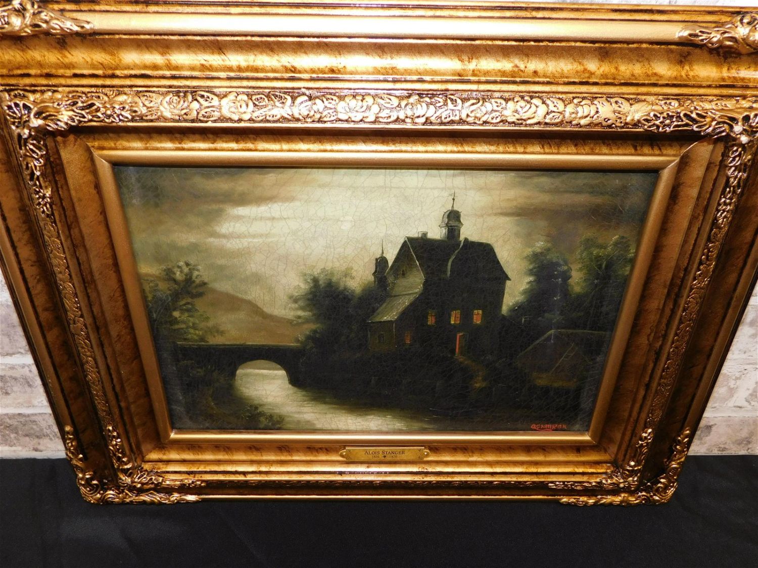 19th Century Oil on Canvas by Alois Stanger (1836-1870). Depicting House on River by a Bridge. Has some crazing. Signed lower right. Measures 17" tall x 21" wide. All invoices must be paid within 24 hours of the sale. Shipping options are the Liveaship from liveauctionners as seen on the listing, in-house shipping on small lots, and the local UPS Store. Liveship is only one option. Please see shipping terms for all options. Local pickups are at our Monmouth Junction location on Thursday, Friday, Saturday and Monday ONLY! All pickups are by appointment only. Any condition issues will be listed in the description. Please read the terms for full information.