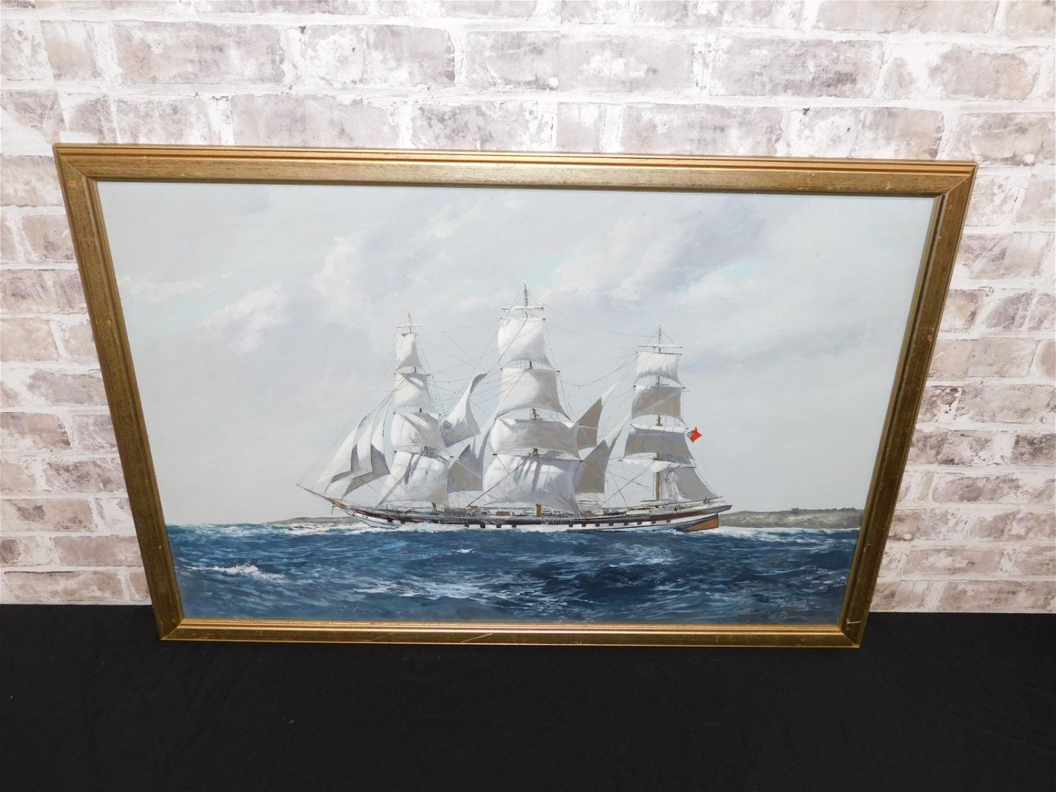 Oil on Canvas depicting Sailing Ship with British Flag. Signed lower right – Undetermined. Frame has a scratch. Measures 27" tall x 38.25" wide. All invoices must be paid within 24 hours of the sale. Shipping options are the Liveaship from liveauctionners as seen on the listing, in-house shipping on small lots, and the local UPS Store. Liveship is only one option. Please see shipping terms for all options. Local pickups are at our Monmouth Junction location on Thursday, Friday, Saturday and Monday ONLY! All pickups are by appointment only. Any condition issues will be listed in the description. Please read the terms for full information.