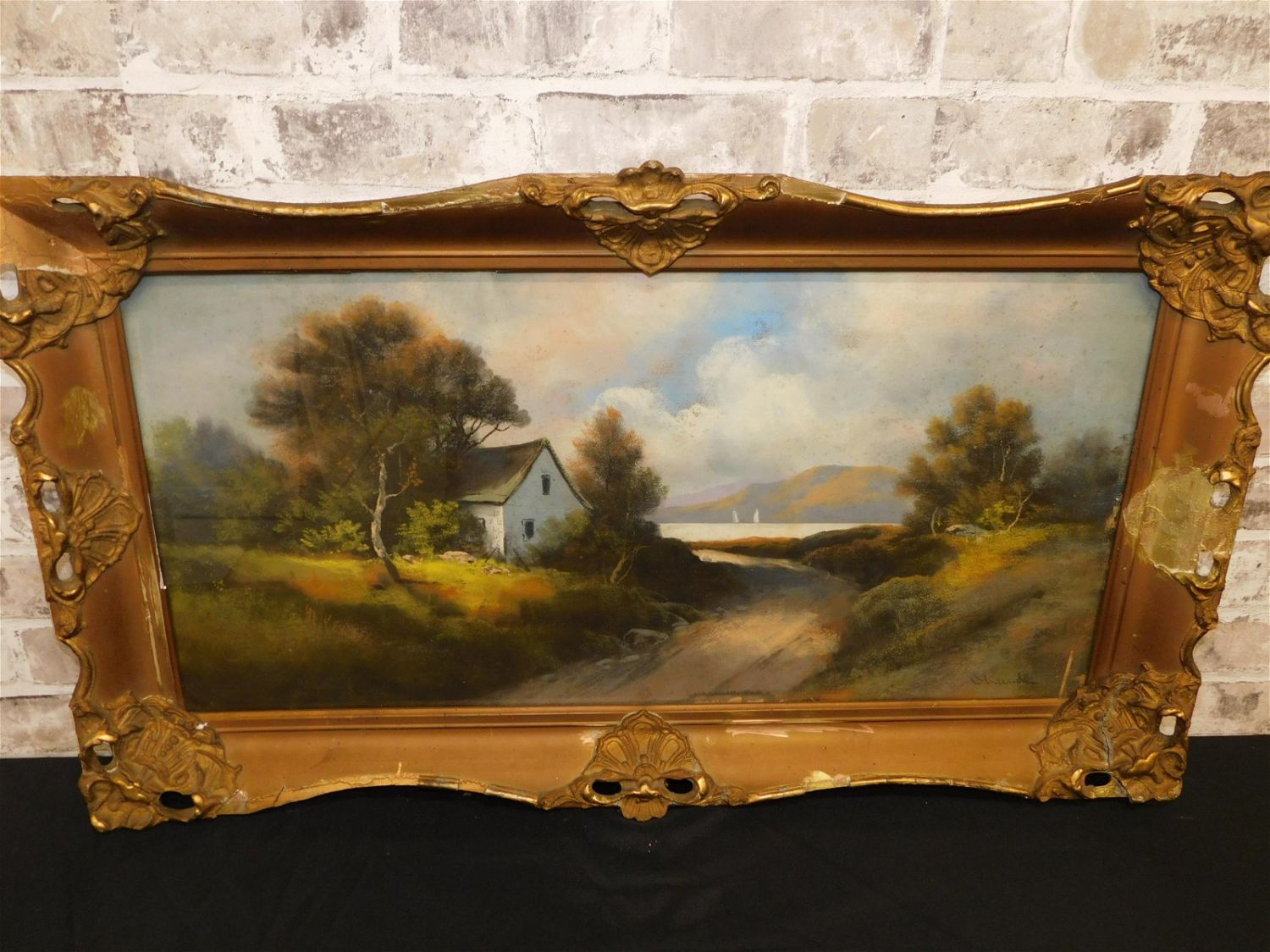 19th Century Pastel Painting by William Henry Chandler (1854-1928). Depicting Cottage Scene near a lake with sailboats in background. Has some staining. Could use cleaning. Signed lower right. Frame is heavily damaged. Measures 20" tall x 33" wide. All invoices must be paid within 24 hours of the sale. Shipping options are the Liveaship from liveauctionners as seen on the listing, in-house shipping on small lots, and the local UPS Store. Liveship is only one option. Please see shipping terms for all options. Local pickups are at our Monmouth Junction location on Thursday, Friday, Saturday and Monday ONLY! All pickups are by appointment only. Any condition issues will be listed in the description. Please read the terms for full information.