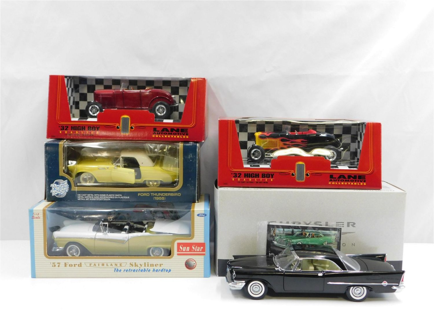 Lot of 5 Diecast Cars – All 1:18 Scale including (2) Lane Collectibles ’32 High Boy Roadsters – One red and one black with flames, Ertl 1957 Chrysler 300 C, Sun Star ’57 Ford Fairlane Skyliner, and Road Tough 1955 Ford Thunderbird. All come in original boxes. All invoices must be paid within 24 hours of the sale. Shipping options are the Liveaship from liveauctionners as seen on the listing, in-house shipping on small lots, and the local UPS Store. Liveship is only one option. Please see shipping terms for all options. Local pickups are at our Monmouth Junction location on Friday, Saturday and Monday ONLY! All pickups are by appointment only. Any condition issues will be listed in the description. Please read the terms for full information.