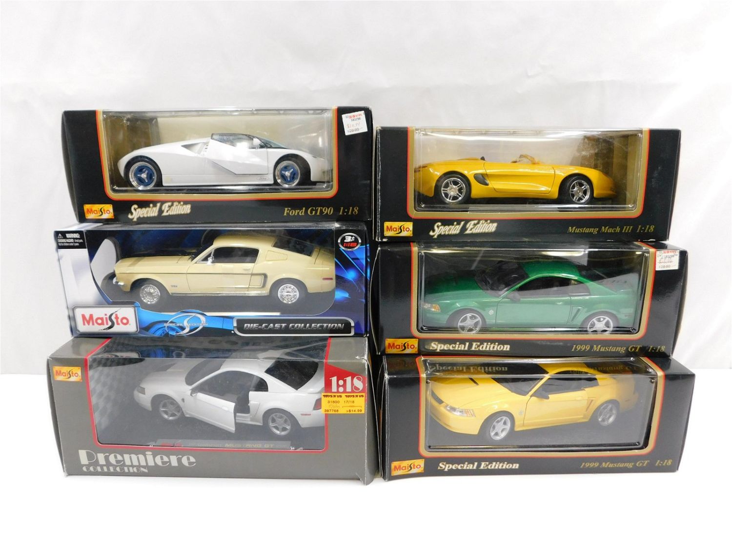 Lot of 6 Maisto Ford Diecast Cars including 1968 Ford Mustang Cobra Jet, 1999 35th Anniversary Mustang GT, (2) 1999 Mustang GT (Yellow and Green), Mustang Mach III, and Ford GT90. All are 1:18 Scale and come in original boxes. All invoices must be paid within 24 hours of the sale. Shipping options are the Liveaship from liveauctionners as seen on the listing, in-house shipping on small lots, and the local UPS Store. Liveship is only one option. Please see shipping terms for all options. Local pickups are at our Monmouth Junction location on Friday, Saturday and Monday ONLY! All pickups are by appointment only. Any condition issues will be listed in the description. Please read the terms for full information.