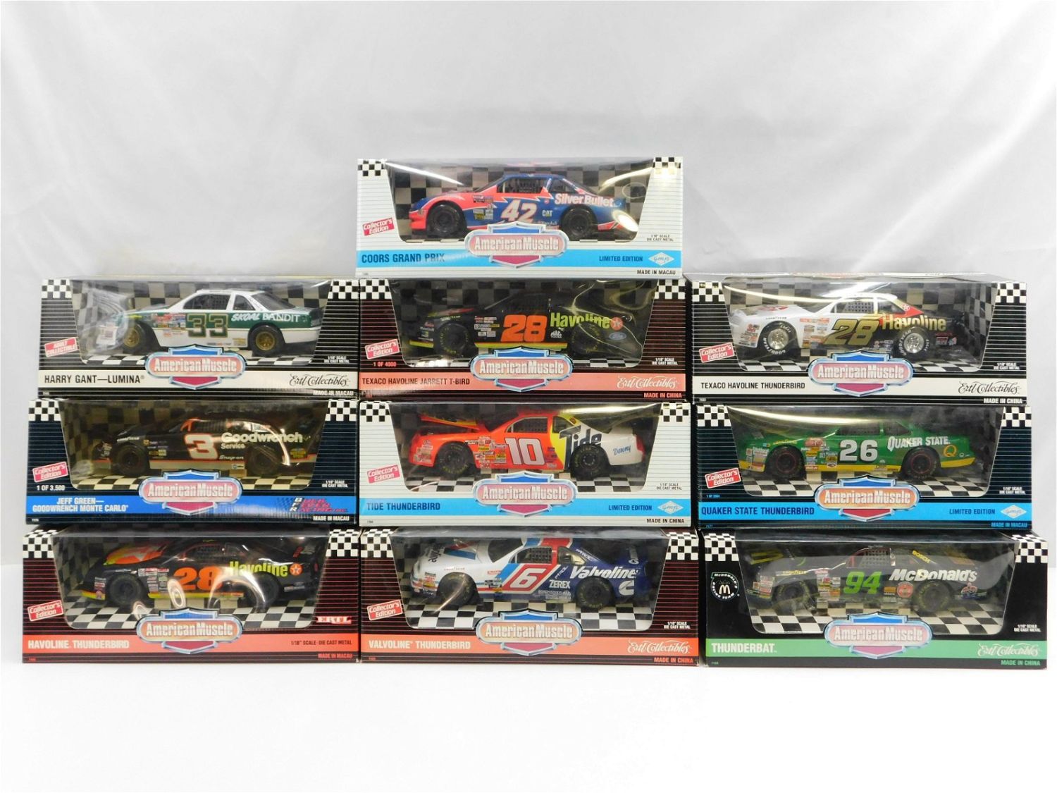 Lot of 10 American Muscle NASCAR Diecast Cars 1:18 Scale. Includes McDonald’s Racing Team Thunderbat, Quaker State Thunderbird, Valvoline Thunderbird, Tide Thunderbird, Texaco Havoline Jarrett T-Bird, Coors Grand Prix, Texaco Havoline Thunderbird, Harry Grant Lumina, Jeff Green Goodwrench Monte Carlo, and Havoline Thunderbird. All come in original boxes. All invoices must be paid within 24 hours of the sale. Shipping options are the Liveaship from liveauctionners as seen on the listing, in-house shipping on small lots, and the local UPS Store. Liveship is only one option. Please see shipping terms for all options. Local pickups are at our Monmouth Junction location on Friday, Saturday and Monday ONLY! All pickups are by appointment only. Any condition issues will be listed in the description. Please read the terms for full information.