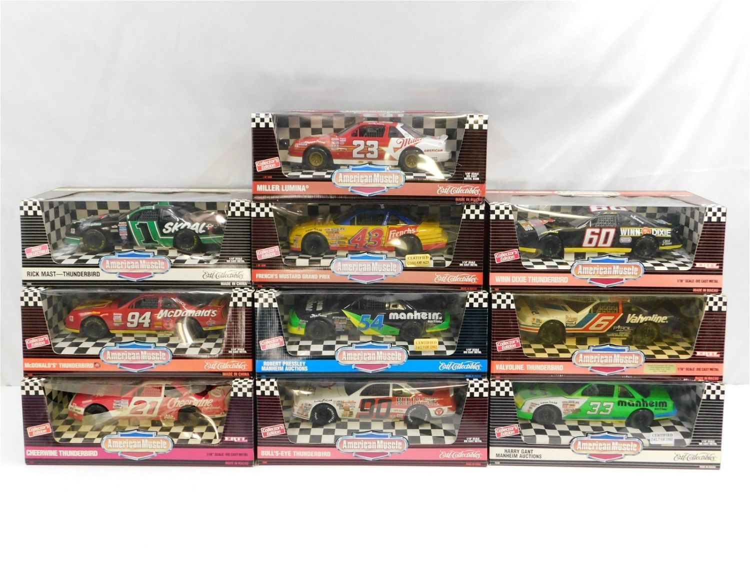 Lot of 10 American Muscle NASCAR Diecast Cars 1:18 Scale. Includes Miller Lumina, Winn Dixie Thunderbird, Valvoline Thunderbird, Harry Gant Manheim Auctions, Rick Mast Thunderbird, McDonald’s Thunderbird, Cheerwine Thunderbird – Damage to plastic on box, French’s Mustard Grand Prix, Robert Pressley Manheim Auctions, and Bulls-Eye Thunderbird. All come in original boxes. All invoices must be paid within 24 hours of the sale. Shipping options are the Liveaship from liveauctionners as seen on the listing, in-house shipping on small lots, and the local UPS Store. Liveship is only one option. Please see shipping terms for all options. Local pickups are at our Monmouth Junction location on Friday, Saturday and Monday ONLY! All pickups are by appointment only. Any condition issues will be listed in the description. Please read the terms for full information.