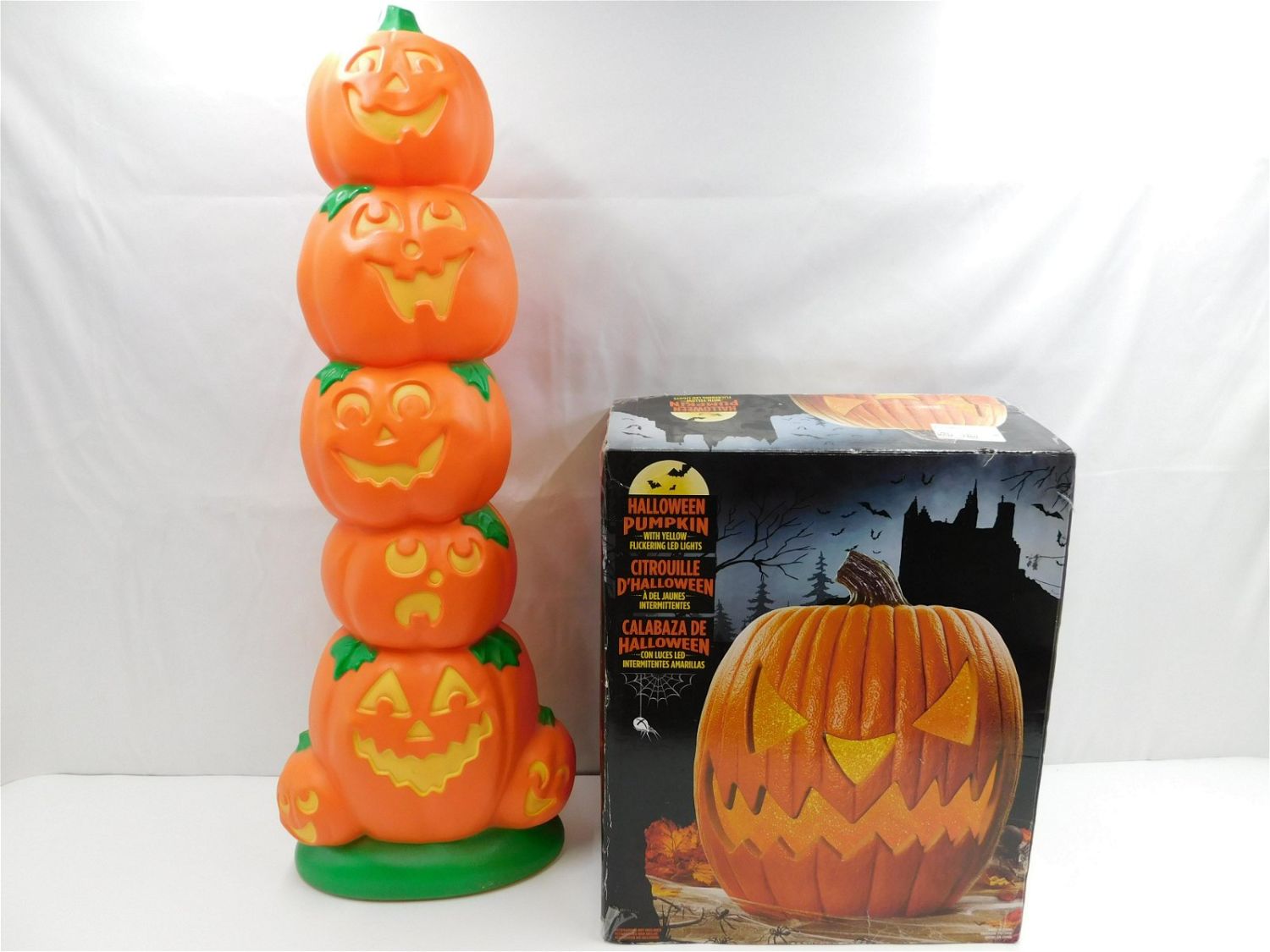 Lot of 2 Halloween decorations including a blow-mold pumpkin totem pole measures 39 inches tall by 13 inches wide and a Halloween resin pumpkin with yellow lights and sounds new in box. All invoices must be paid within 24 hours of the sale. Shipping options are the Liveaship from liveauctionners as seen on the listing, in-house shipping on small lots, and the local UPS Store. Liveship is only one option. Please see shipping terms for all options. Local pickups are at our Monmouth Junction location on Friday, Saturday and Monday ONLY! All pickups are by appointment only. Any condition issues will be listed in the description. Please read the terms for full information.