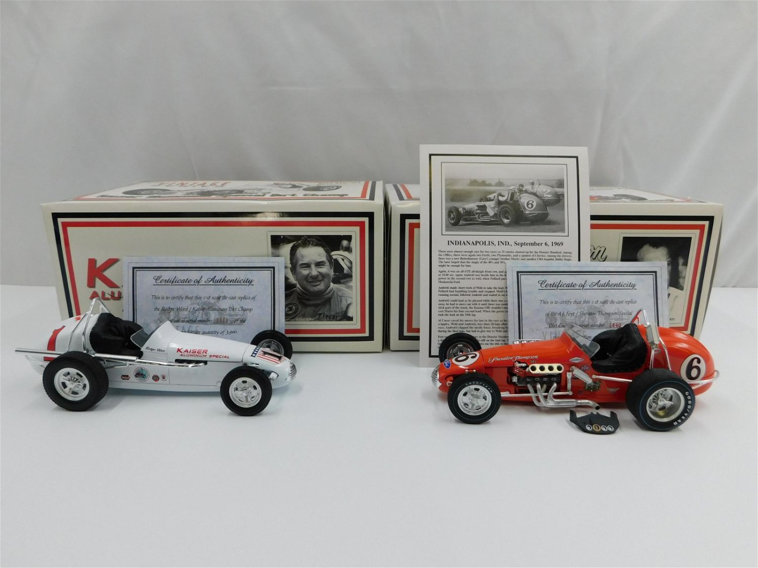 Lot of 2 GMP Vintage Series Dirt Champ 1:18 Scale Cars including Roger Ward/Kaiser Aluminum Dirt Champ Sprint Car – Release #1 and A.J. Foyt/Sheraton Thompson Special Dirt Champ – Release #2. The Sheraton Thompson car appears to be missing a windshield and the dashboard is loose from car. Both come in original boxes. All invoices must be paid within 24 hours of the sale. Shipping options are the Liveaship from liveauctionners as seen on the listing, in-house shipping on small lots, and the local UPS Store. Liveship is only one option. Please see shipping terms for all options. Local pickups are at our Monmouth Junction location on Friday, Saturday and Monday ONLY! All pickups are by appointment only. Any condition issues will be listed in the description. Please read the terms for full information.