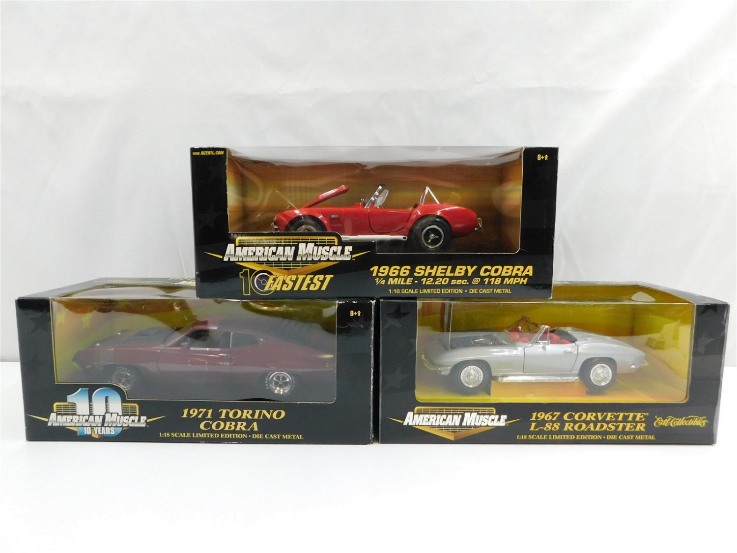 Lot of 3 American Muscle 1:18 Scale Diecast Cars including 1971 Torino Cobra, 1967 Corvette L-88 Roadster, and 1966 Shelby Cobra. All come in original boxes. All invoices must be paid within 24 hours of the sale. Shipping options are the Liveaship from liveauctionners as seen on the listing, in-house shipping on small lots, and the local UPS Store. Liveship is only one option. Please see shipping terms for all options. Local pickups are at our Monmouth Junction location on Friday, Saturday and Monday ONLY! All pickups are by appointment only. Any condition issues will be listed in the description. Please read the terms for full information.