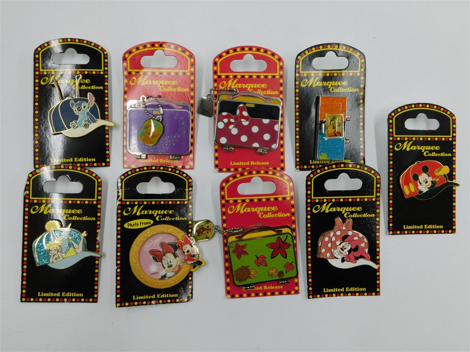 Lot of 9 Disney Marquee Collection Limited Edition Pins including (4) Baseball Caps, (3) Hinged Lunch Box, Hinged Locker and Picture Frame. All come on card backs. All invoices must be paid within 24 hours of the sale. Shipping options are the Liveaship from liveauctionners as seen on the listing, in-house shipping on small lots, and the local UPS Store. Liveship is only one option. Please see shipping terms for all options. Local pickups are at our Monmouth Junction location on Friday, Saturday and Monday ONLY! All pickups are by appointment only. Any condition issues will be listed in the description. Please read the terms for full information.