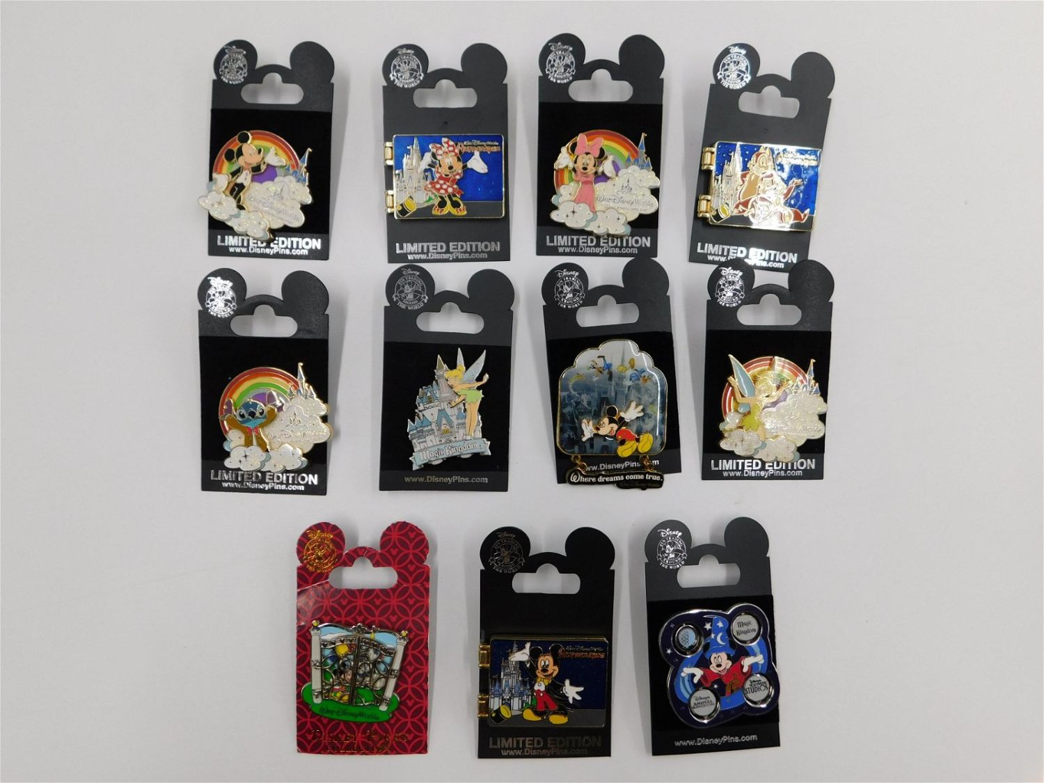 Lot of 11 Disney Mixed Pins including (4) Walt Disney World Where Dreams Come True Rainbow Pins, (3) Walt Disney World Hinged Autographs, (3) Walt Disney World Mixed Pins, and (1) 4 Parks Sorcerer Mickey Spinner Pin. Most pins in this lot are Limited Edition. All come with card backs. All invoices must be paid within 24 hours of the sale. Shipping options are the Liveaship from liveauctionners as seen on the listing, in-house shipping on small lots, and the local UPS Store. Liveship is only one option. Please see shipping terms for all options. Local pickups are at our Monmouth Junction location on Friday, Saturday and Monday ONLY! All pickups are by appointment only. Any condition issues will be listed in the description. Please read the terms for full information.