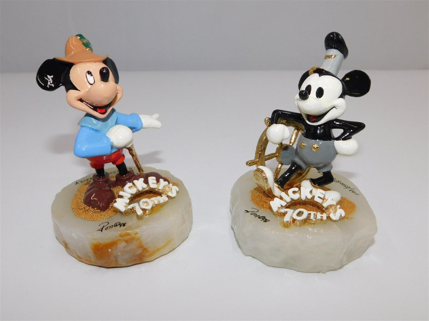 Lot of 2 Mickey 70th Birthday Figurines including Steamboat Willie and Brave Little Tailor. Hand Painted Metal on Onyx Bases. Both Signed and Dated 1998. Both limited to 2500 pieces. Measures approx. 3.5" tall x 2.5" wide. All invoices must be paid within 24 hours of the sale. Shipping options are the Liveaship from liveauctionners as seen on the listing, in-house shipping on small lots, and the local UPS Store. Liveship is only one option. Please see shipping terms for all options. Local pickups are at our Monmouth Junction location on Friday, Saturday and Monday ONLY! All pickups are by appointment only. Any condition issues will be listed in the description. Please read the terms for full information.
