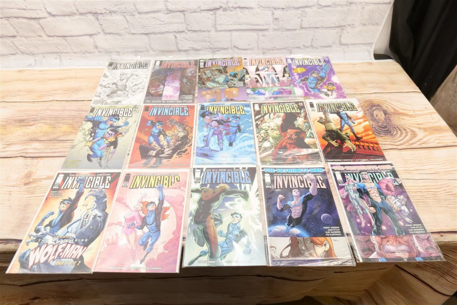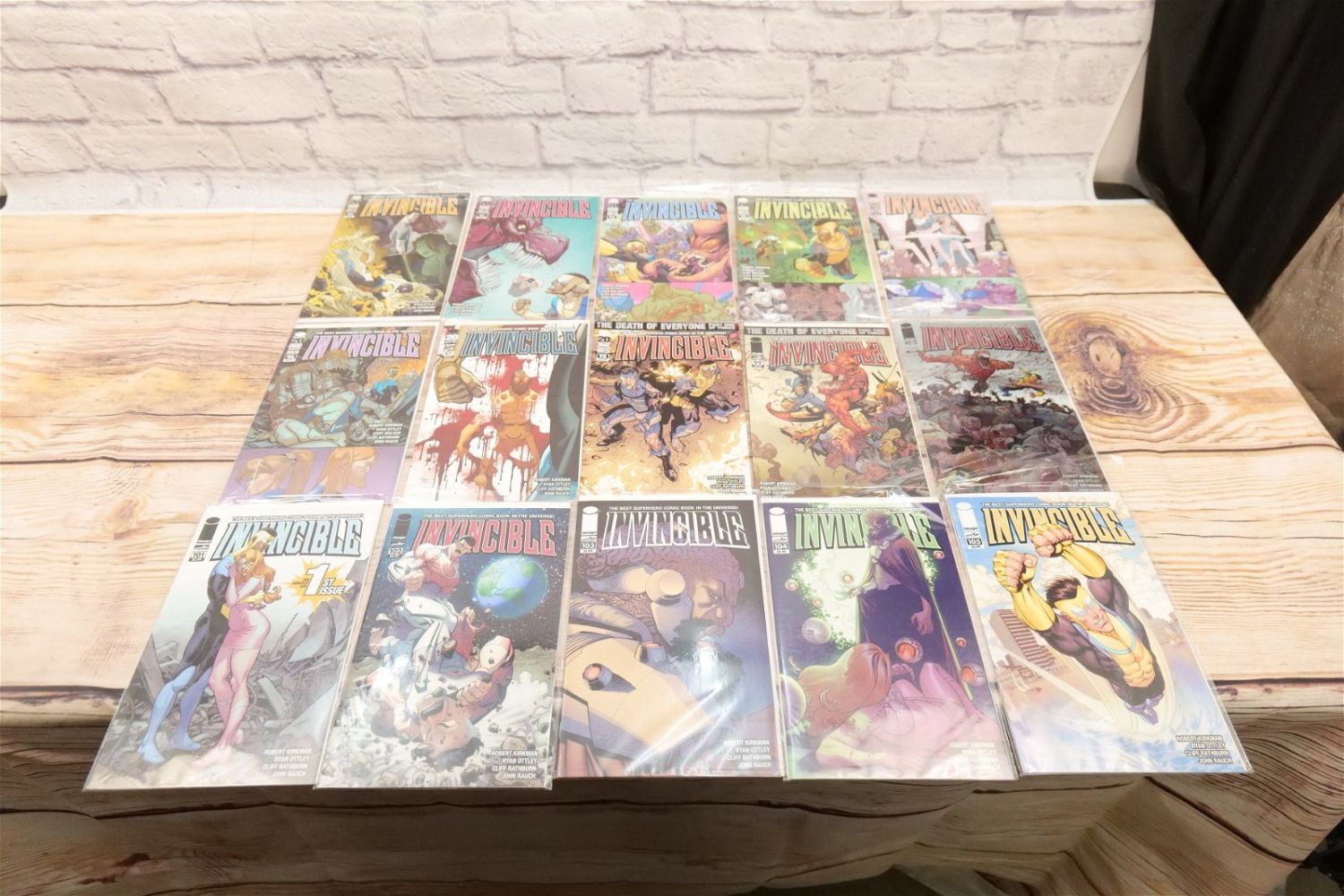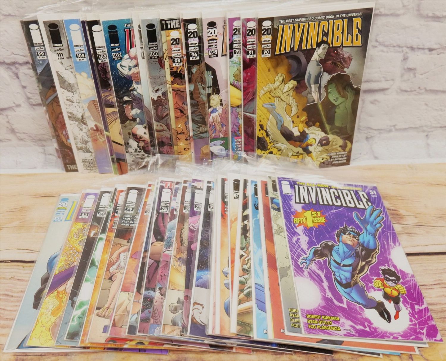 Lot of 42 Invincible Comics by Image including issues #51-59, 71, 72, 74-83, 88-93, 95-105 and 111. Includes 2 copies of #95, 96, and 99. All invoices must be paid within 24 hours of the sale. We offer multiple shipping options, please read the shipping terms. We also offer Pick-Ups Thursday, Friday, Saturday, and Monday immediately following the sale. BY APPOINTMENT ONLY.