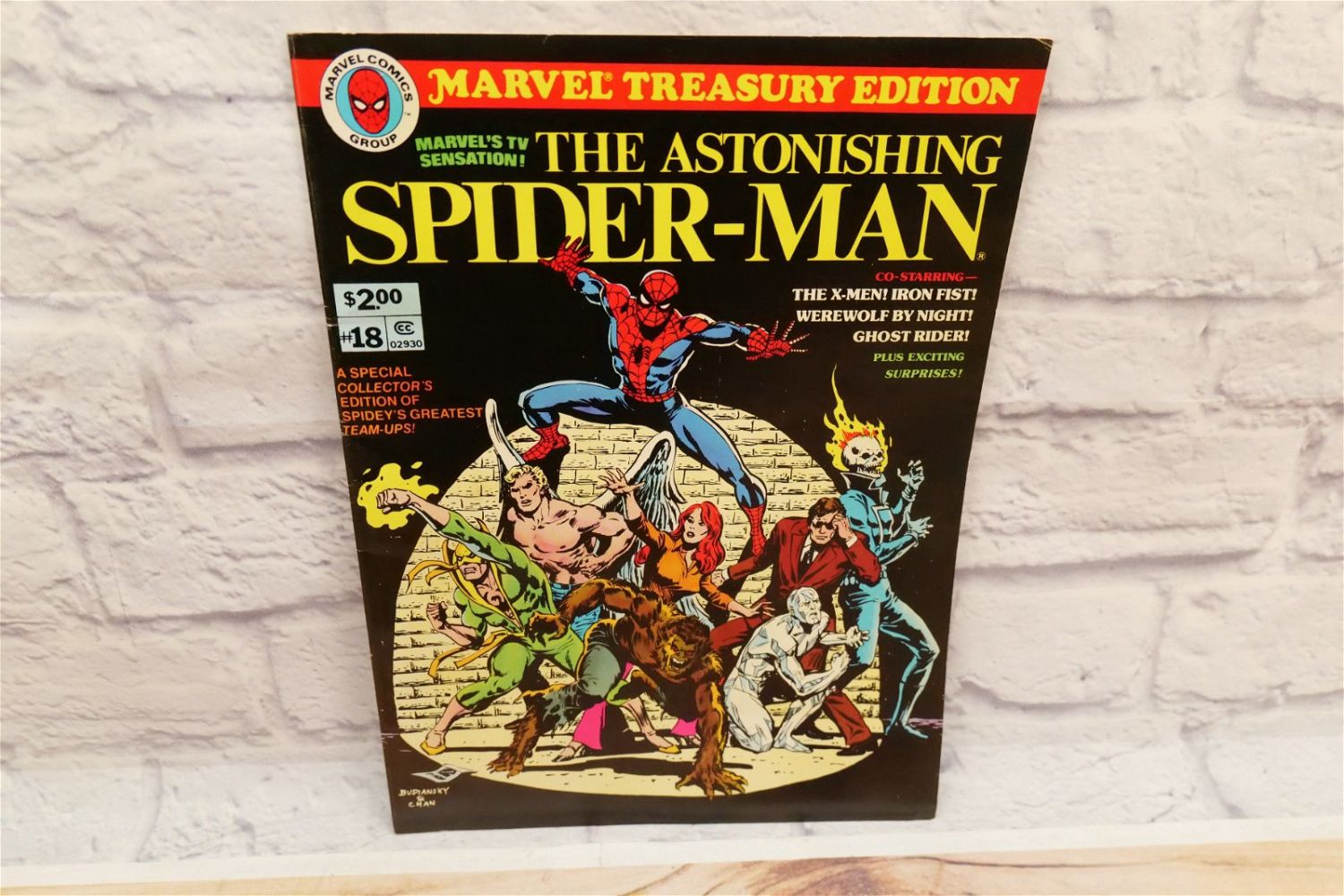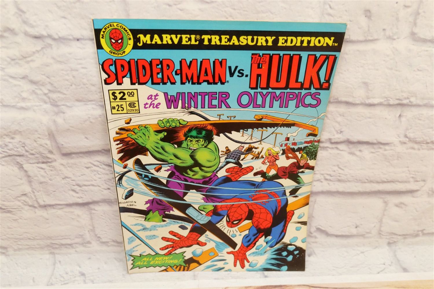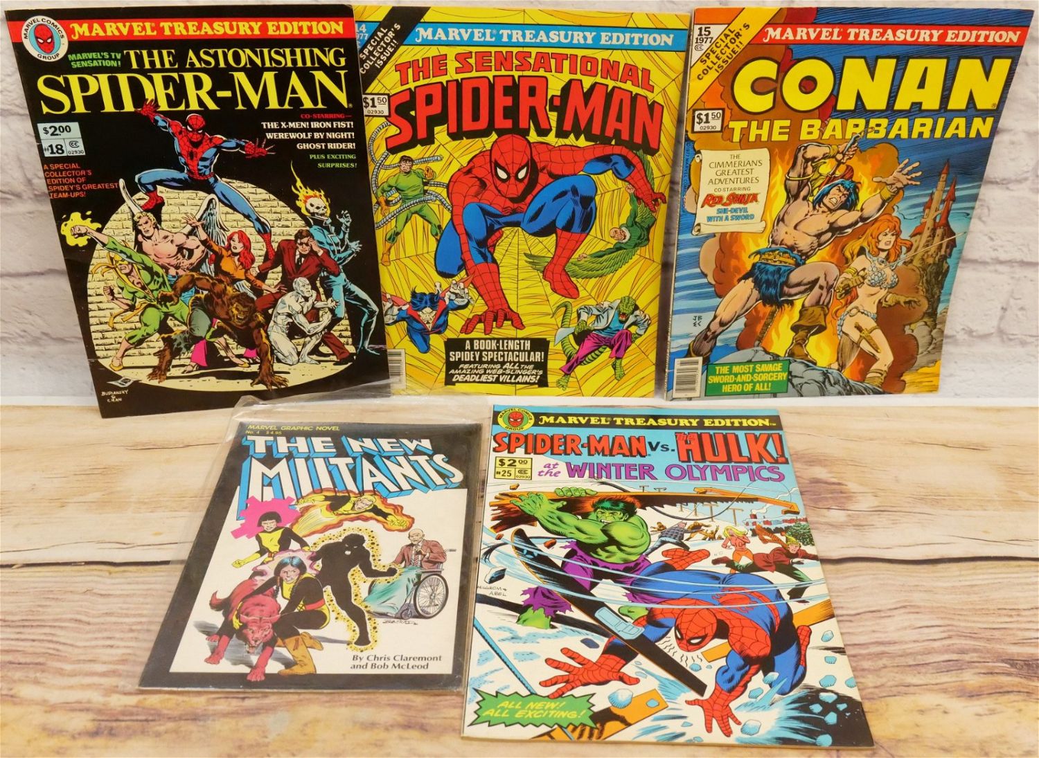 Lot of Marvel Treasury Edition Comics and Marvel Graphic Novel #4. The Treasury Editions include The Sensational Spider-Man, Conan the Barbarian, The Astonishing Spider-Man, and Spider-Man vs. Hulk at the Winter Olympics. Marvel Graphic Novel #4 is the 1st Appearance of The New Mutants – 1st Edition. All invoices must be paid within 24 hours of the sale. We offer multiple shipping options, please read the shipping terms. We also offer Pick-Ups Thursday, Friday, Saturday, and Monday immediately following the sale. BY APPOINTMENT ONLY.