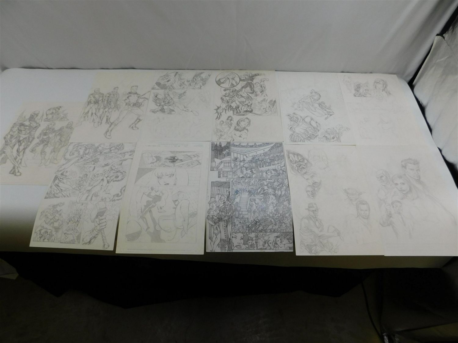 Large Lot of Character Pencil Sketches including Spider-Man and Black Widow by Wellington Dias, J. Toledo Signed Pencilwork, Various Sketches of Indiana Jones, Buffy, Yoda, Thor, Iron Man, Silver Surfer, Wonder Woman, Superman, Captain America, and Many More. Largest measures 17" x 11.25". All items must be paid for within 24 hours of the sale. Shipping options are the Liveaship from liveauctionners as seen on the listing, in-house shipping on small lots, and the local UPS Store. Liveship is only one option. Please see shipping terms for all options. Local pickups are at our Monmouth Junction, NJ location on Friday, Saturday and Monday ONLY! All pickups are by appointment only. Any condition issues will be listed in the description. Please read the terms for full information.
