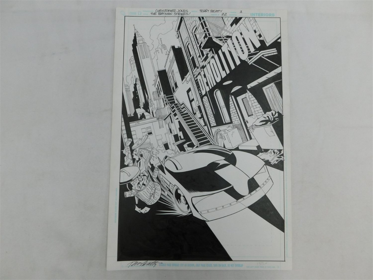 Original Comic Book Art – DC Comics – The Batman Strikes Issue #22 Page 1 – Splash and Title Page. Splash Page image of Batmobile. Penciler Christopher Jones – Inker Terry Beatty. Signed lower left Terry Beatty. Measures 17" tall x 11.5" wide. All items must be paid for within 24 hours of the sale. Shipping options are the Liveaship from liveauctionners as seen on the listing, in-house shipping on small lots, and the local UPS Store. Liveship is only one option. Please see shipping terms for all options. Local pickups are at our Monmouth Junction, NJ location on Friday, Saturday and Monday ONLY! All pickups are by appointment only. Any condition issues will be listed in the description. Please read the terms for full information.