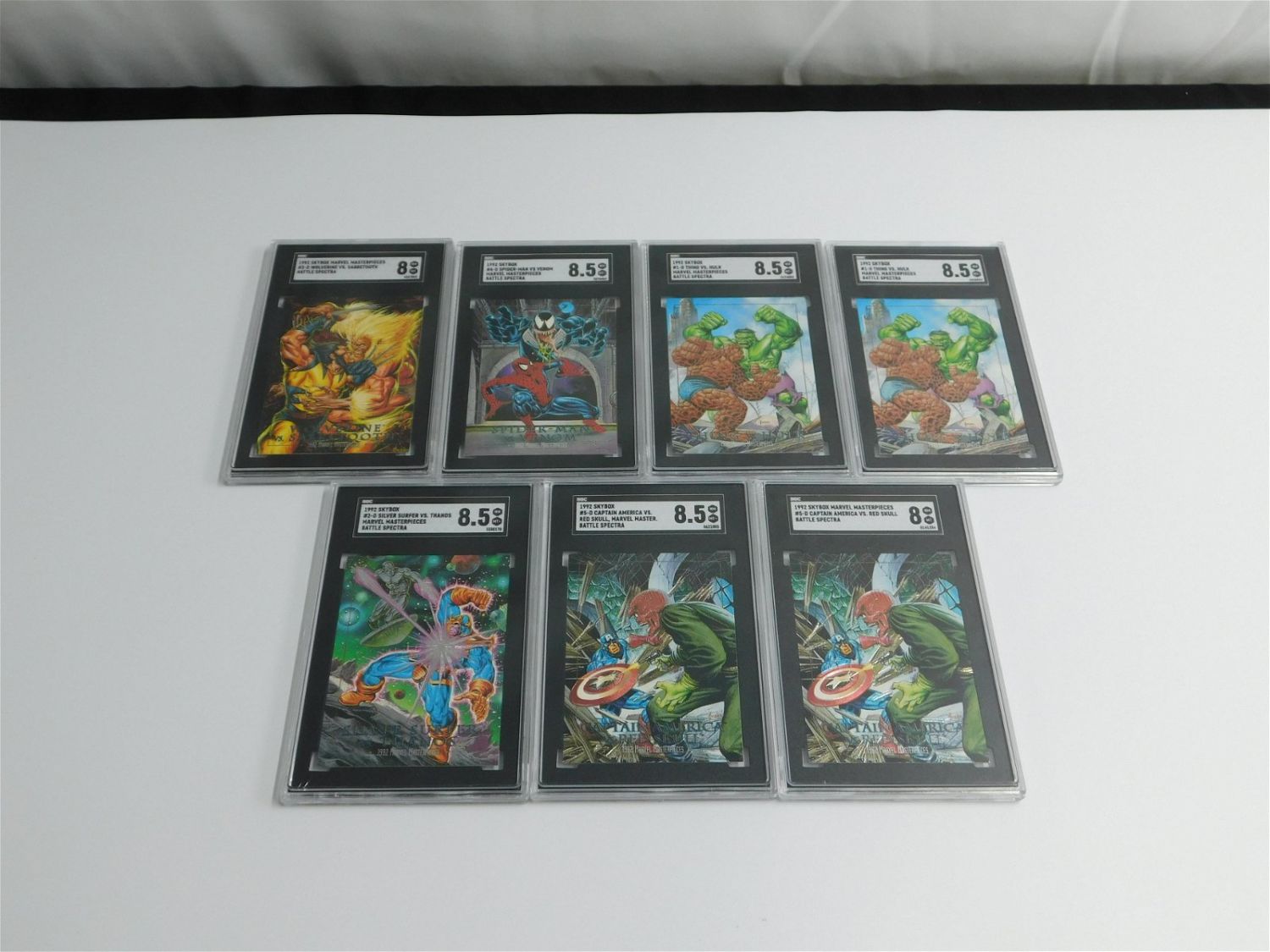 Lot of 7 SGC Graded 1992 Marvel Masterpiece Battle Spectra Cards including #2 Silver Surfer vs. Thanos – 8.5 NM MT+, (2) #5 Captain America vs. Red Skull – 8.5 NM-MT+ & 8 NM MT, (2) #1 Thing vs Hulk – 8.5 NM-MT+, #3 Wolverine vs Sabretooth – 8 NM MT, and #4 Spider-Man vs Venom – 8.5 NM MT+. All items must be paid for within 24 hours of the sale. Shipping options are the Liveaship from liveauctionners as seen on the listing, in-house shipping on small lots, and the local UPS Store. Liveship is only one option. Please see shipping terms for all options. Local pickups are at our Monmouth Junction, NJ location on Friday, Saturday and Monday ONLY! All pickups are by appointment only. Any condition issues will be listed in the description. Please read the terms for full information.