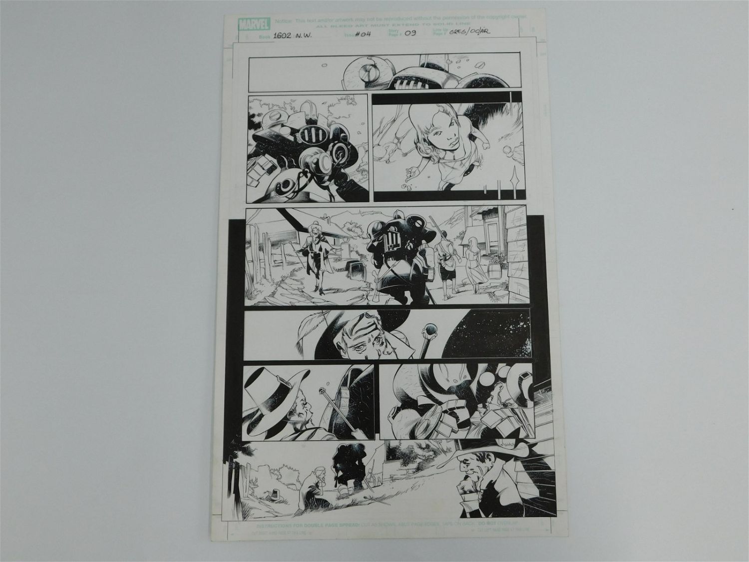 Original Comic Book Art – Marvel Comics – 1602 New World – Issue #4 Page 9. Penciler Greg Tocchini – Inker Oclair Albert. Includes images of Anthony Stark (Lord Iron) and Virginia Dare. Measures 17.25" tall x 11" wide. All items must be paid for within 24 hours of the sale. Shipping options are the Liveaship from liveauctionners as seen on the listing, in-house shipping on small lots, and the local UPS Store. Liveship is only one option. Please see shipping terms for all options. Local pickups are at our Monmouth Junction, NJ location on Friday, Saturday and Monday ONLY! All pickups are by appointment only. Any condition issues will be listed in the description. Please read the terms for full information.