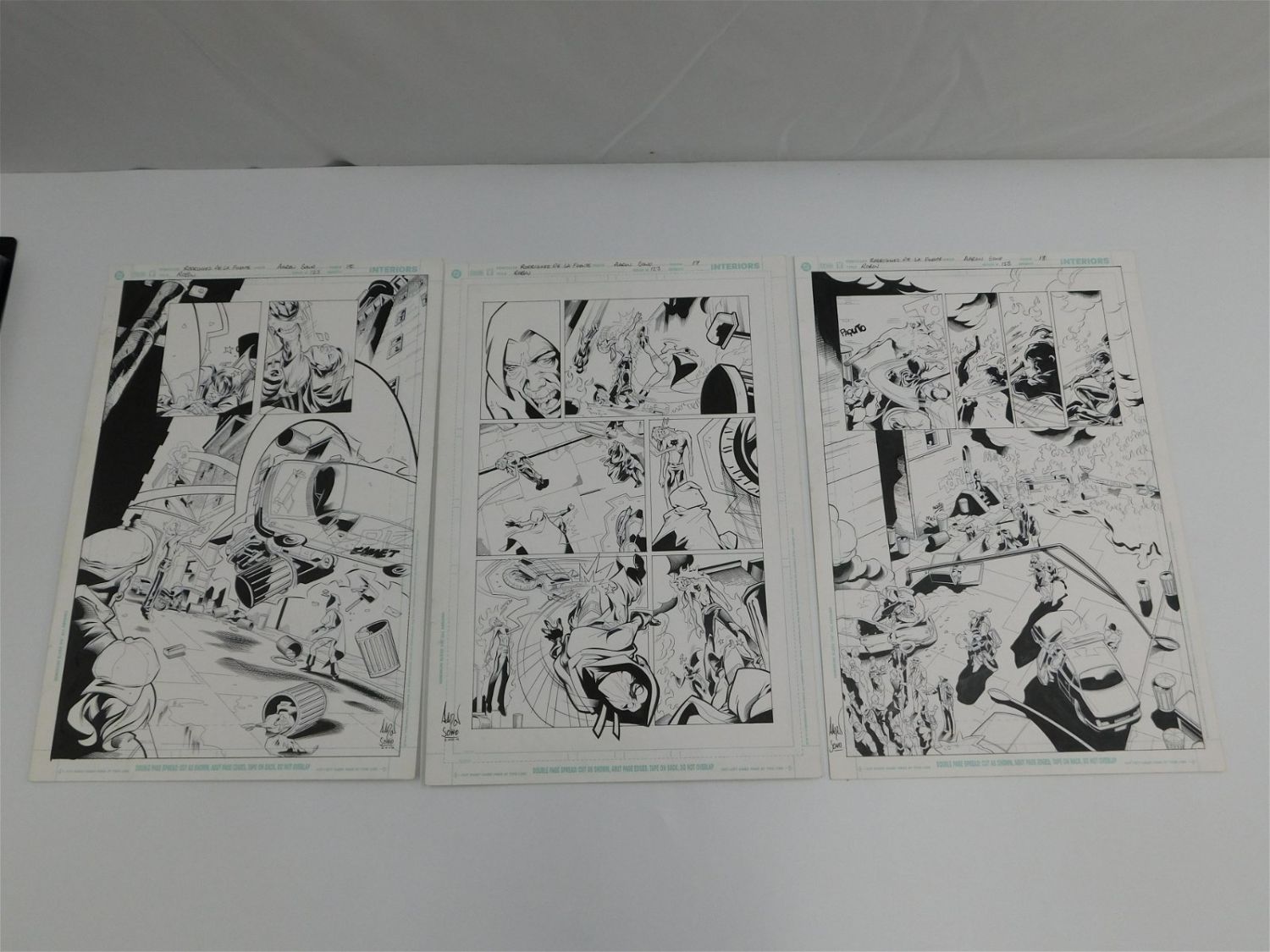 Lot of 3 Original Comic Book Art – DC Comics – Robin – Issue #123 Pages 15, 17, & 18. Penciler Rodriguez De La Fuente – Inker Aaron Sowd. All Signed by Inker Aaron Sowd. Includes images of Robin, Spoiler, and Johnny Warlock. Measures 17 x 11. All items must be paid for within 24 hours of the sale. Shipping options are the Liveaship from liveauctionners as seen on the listing, in-house shipping on small lots, and the local UPS Store. Liveship is only one option. Please see shipping terms for all options. Local pickups are at our Monmouth Junction, NJ location on Friday, Saturday and Monday ONLY! All pickups are by appointment only. Any condition issues will be listed in the description. Please read the terms for full information.