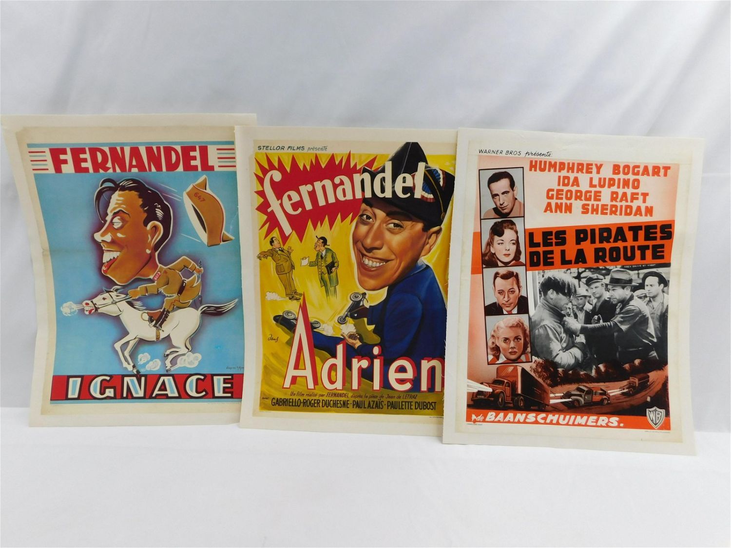 Lot of 3 Foreign Movie Posters including "Fernandel Adrien" Adrian Fernandel, "Fernandel Ignace" Ignace Fernandel and "Les Pirates de la Route" They Drive by Night. All from Belgium. All have small tears and staining. All matted on canvas. Largest measures 21" tall x 16" wide. All invoices must be paid within 24 hours of the sale. Shipping options are the Liveaship from liveauctionners as seen on the listing, in-house shipping on small lots, and the local UPS Store. Liveship is only one option. Please see shipping terms for all options. Local pickups are at our Monmouth Junction location on Thursday, Friday, Saturday and Monday ONLY! All pickups are by appointment only. Any condition issues will be listed in the description. Please read the terms for full information.