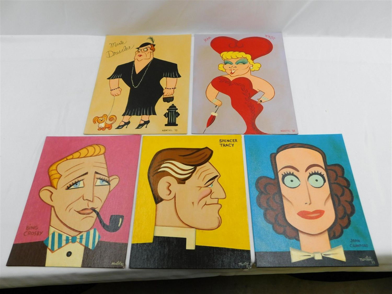 Lot of 5 Movie Star Caricature Paintings Signed by Artist H. Pierre Montiel. Dated 1980’s and 1990’s. Includes Joan Crawford, Bing Crosby, Mae West, Spencer Tracy, and Marie Dressler. Largest measures 16" x 12.25". All invoices must be paid within 24 hours of the sale. Shipping options are the Liveaship from liveauctionners as seen on the listing, in-house shipping on small lots, and the local UPS Store. Liveship is only one option. Please see shipping terms for all options. Local pickups are at our Monmouth Junction location on Thursday, Friday, Saturday and Monday ONLY! All pickups are by appointment only. Any condition issues will be listed in the description. Please read the terms for full information.