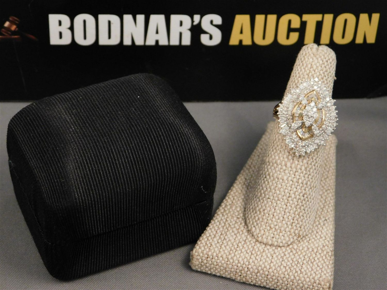 A truly impressive 14K yellow gold and diamond ladies ring. Has many, many round and baguette cut diamonds on the front of the ring that is in a marquise shape. Has original box. Size 6. Is marked. All items must be paid for within 24 hours of the sale. All items are shipped USPS or UPS and will be billed separately. A $12 handling fee is added to the shipping price per lot if shipped in house. Some items or large quantity of purchases will be packed and shipped via the UPS store. Local pickups are at our South Brunswick location on Friday, Saturday and Monday ONLY! All pickups are by appointment only. Any condition issues will be listed in the description. Please read the terms for full information.