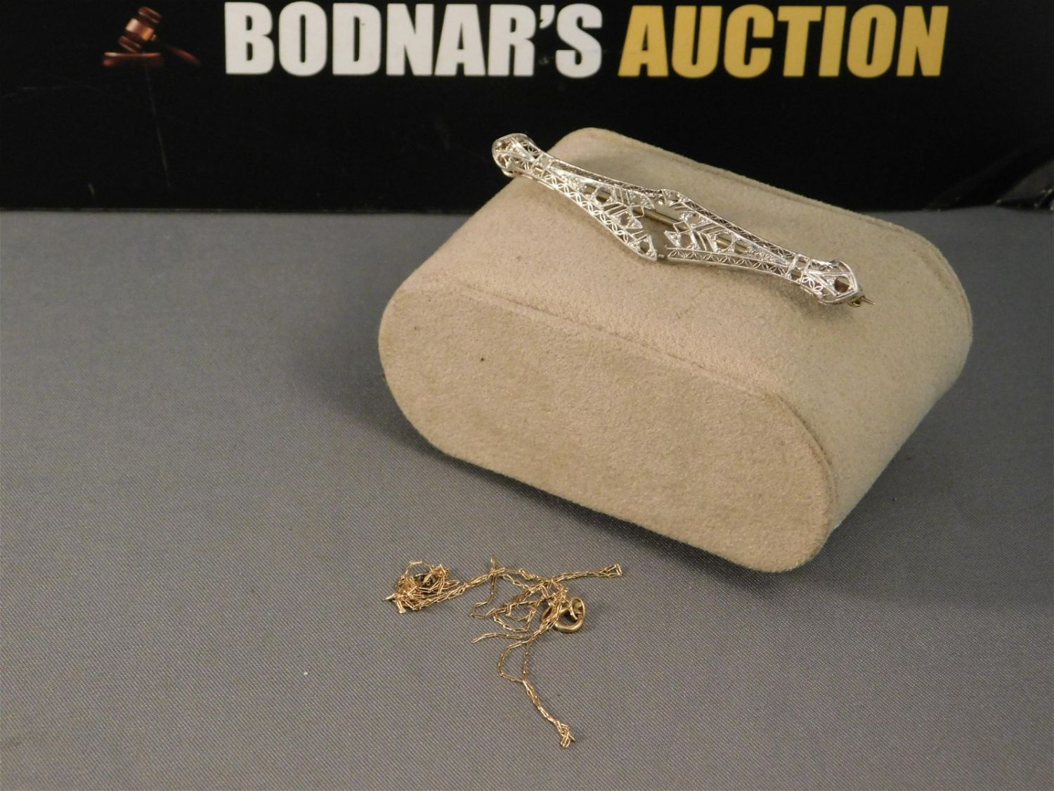 Gold scrap lot of an 18K bar pin that is broken in the center and missing the center stone and a 14K chain that is broken at the end. Weighs approx. 5.5g. All invoices must be paid within 24 hours of the sale. All items are shipped USPS or UPS and will be billed separately. A $12 handling fee is added to the shipping price per lot if shipped in house. Some items or large quantity of purchases will be packed and shipped via the UPS store. Local pickups are at our South Brunswick location on Friday, Saturday and Monday ONLY! All pickups are by appointment only. Any condition issues will be listed in the description. Please read the terms for full information.