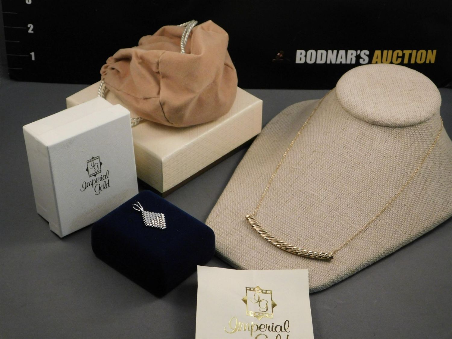 2 14K jewelry pieces including a 14K white gold diamond shaped pendant by Imperial Gold. Has original box, paperwork and outer box and measures approx. 1 1/4". Also included is a 14K hallow gold necklace with a curved pendant at the bottom that is attached at both sides. Has original box and bags. Measures approx. 18". Both are marked and weigh approx. 4.9g. All items must be paid for within 24 hours of the sale. All items are shipped USPS or UPS and will be billed separately. A $12 handling fee is added to the shipping price per lot if shipped in house. Some items or large quantity of purchases will be packed and shipped via the UPS store. Local pickups are at our South Brunswick location on Friday, Saturday and Monday ONLY! All pickups are by appointment only. Any condition issues will be listed in the description. Please read the terms for full information.