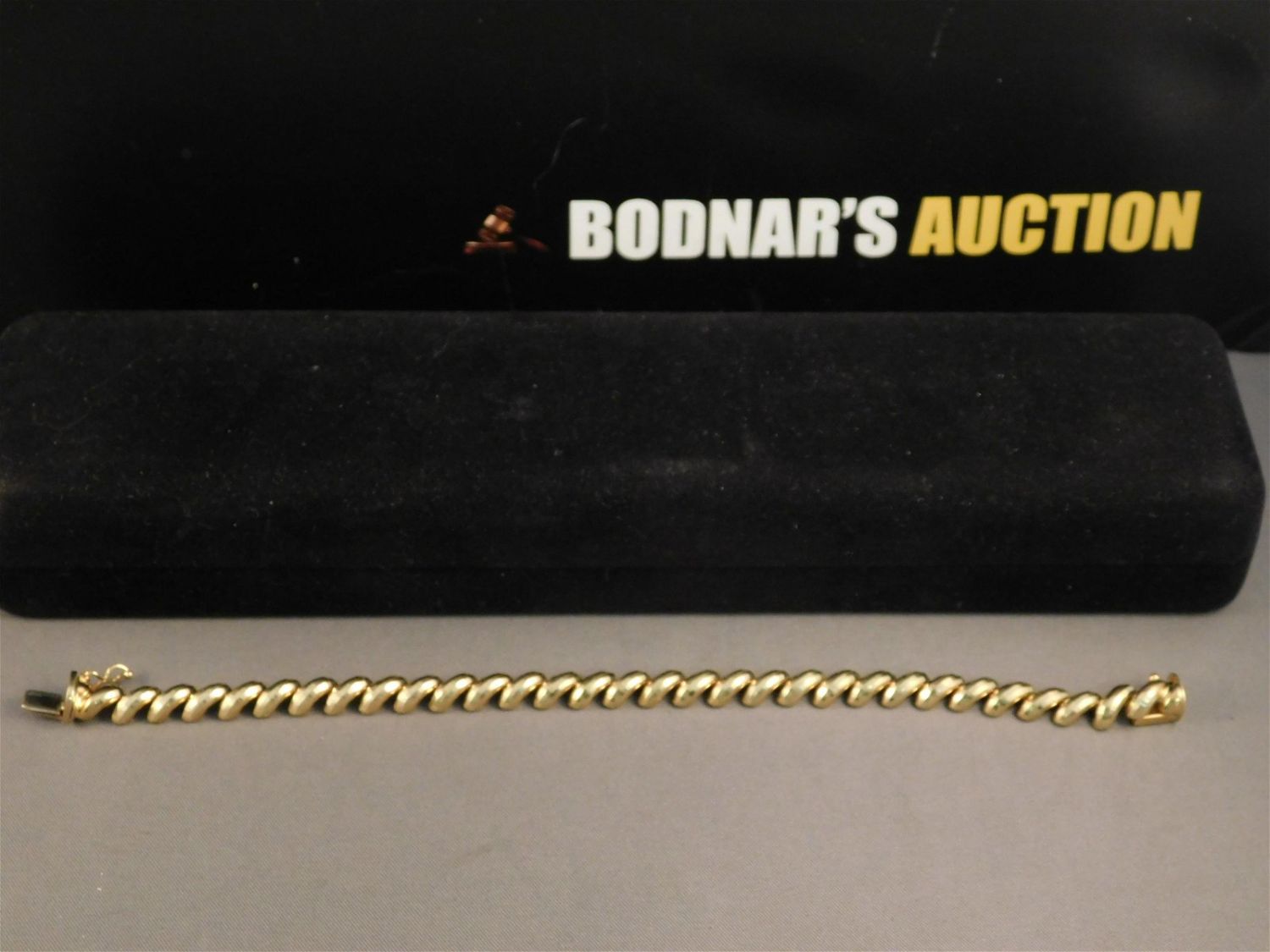 14K yellow gold bracelet with a half circle style link. Each link has been etched into a disco ball style. Has the original box. Measures approx. 7 1/4". Weighs approx. 13.5g. Is marked. All items must be paid for within 24 hours of the sale. All items are shipped USPS or UPS and will be billed separately. A $12 handling fee is added to the shipping price per lot if shipped in house. Some items or large quantity of purchases will be packed and shipped via the UPS store. Local pickups are at our South Brunswick location on Friday, Saturday and Monday ONLY! All pickups are by appointment only. Any condition issues will be listed in the description. Please read the terms for full information.