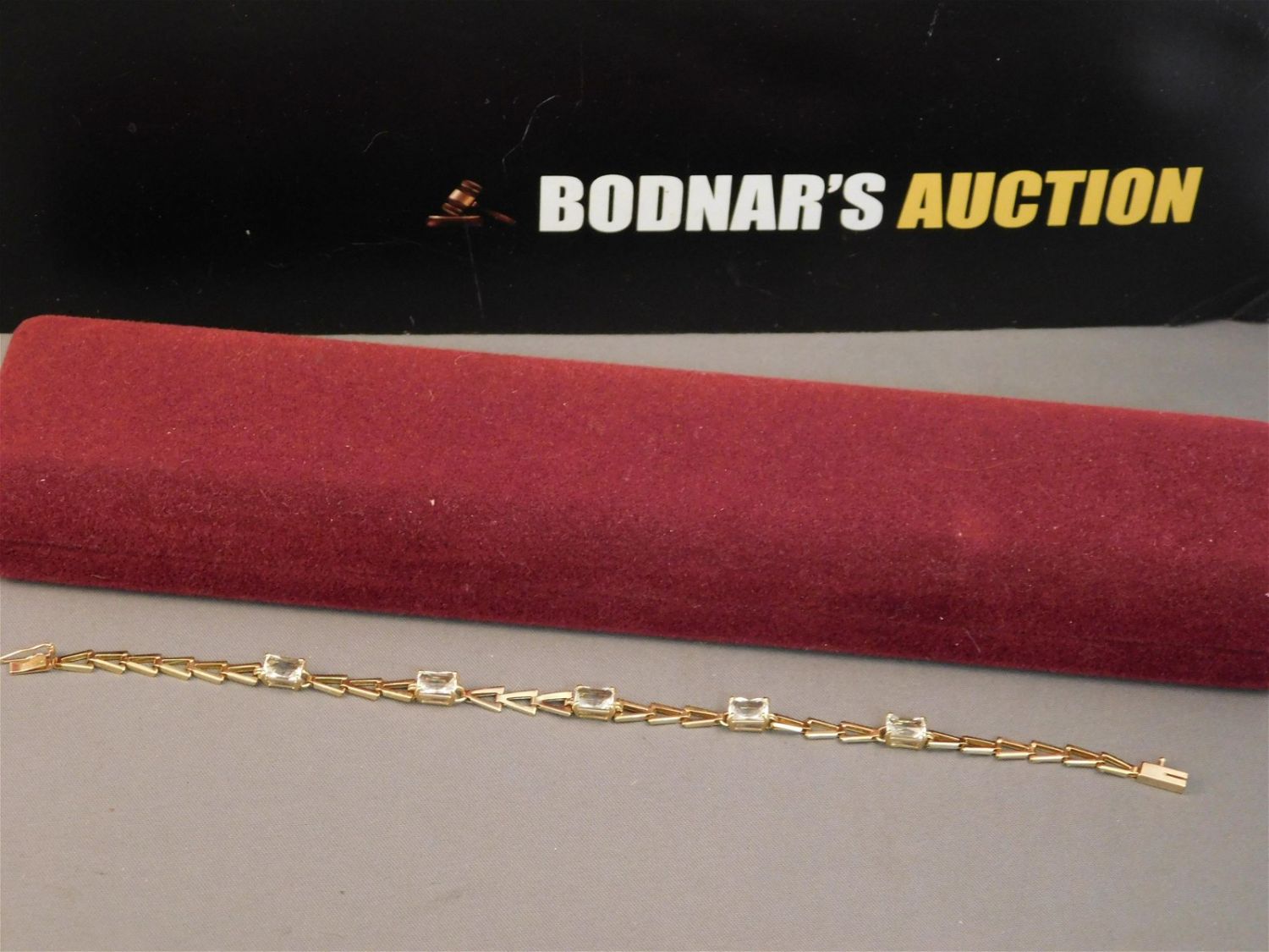 14K Yellow Gold Triangular Link Bracelet with 5 Rectangular Cut White Stones (Possibly White Topaz). Comes in original box. Measures approx. 7.25". All items must be paid for within 24 hours of the sale. All items are shipped USPS or UPS and will be billed separately. A $12 handling fee is added to the shipping price per lot if shipped in house. Some items or large quantity of purchases will be packed and shipped via the UPS store. Local pickups are at our South Brunswick location on Friday, Saturday and Monday ONLY! All pickups are by appointment only. Any condition issues will be listed in the description. Please read the terms for full information.