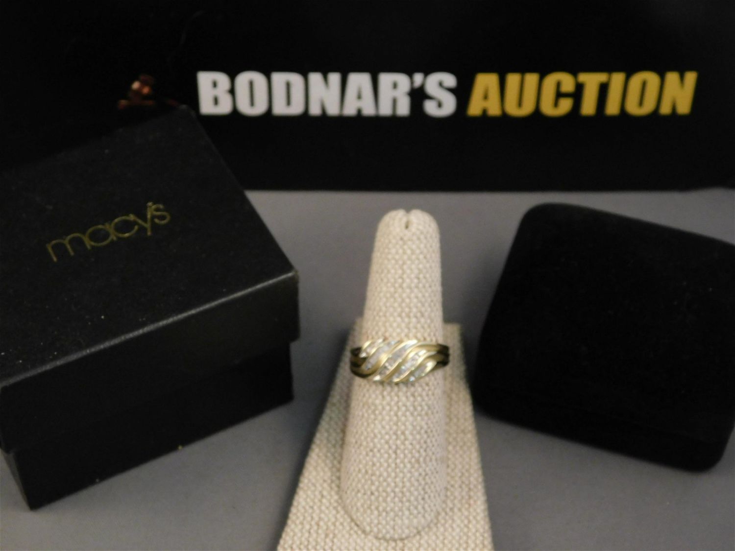 14K Yellow Gold Ladies Ring with Multiple Rows of Baguette Cut Diamonds on the front. From Macys. Comes in original box and outer box. Size 7. All items must be paid for within 24 hours of the sale. All items are shipped USPS or UPS and will be billed separately. A $12 handling fee is added to the shipping price per lot if shipped in house. Some items or large quantity of purchases will be packed and shipped via the UPS store. Local pickups are at our South Brunswick location on Friday, Saturday and Monday ONLY! All pickups are by appointment only. Any condition issues will be listed in the description. Please read the terms for full information.