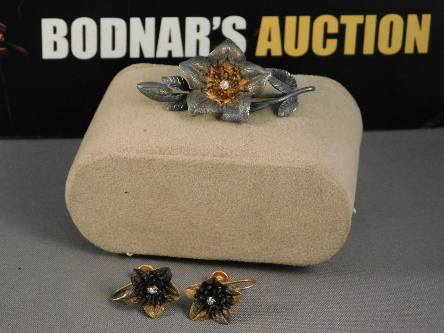 10K yellow gold flower pin and screw back earring set. Each flower has a stone in the center, possibly a white topaz. The earrings are marked and the pin was tested. The pin has some tarnishing. Measures approx. 1/2" – 2". All invoices must be paid within 24 hours of the sale. All items are shipped USPS or UPS and will be billed separately. A $12 handling fee is added to the shipping price per lot if shipped in house. Some items or large quantity of purchases will be packed and shipped via the UPS store. Local pickups are at our South Brunswick location on Friday, Saturday and Monday ONLY! All pickups are by appointment only. Any condition issues will be listed in the description. Please read the terms for full information.