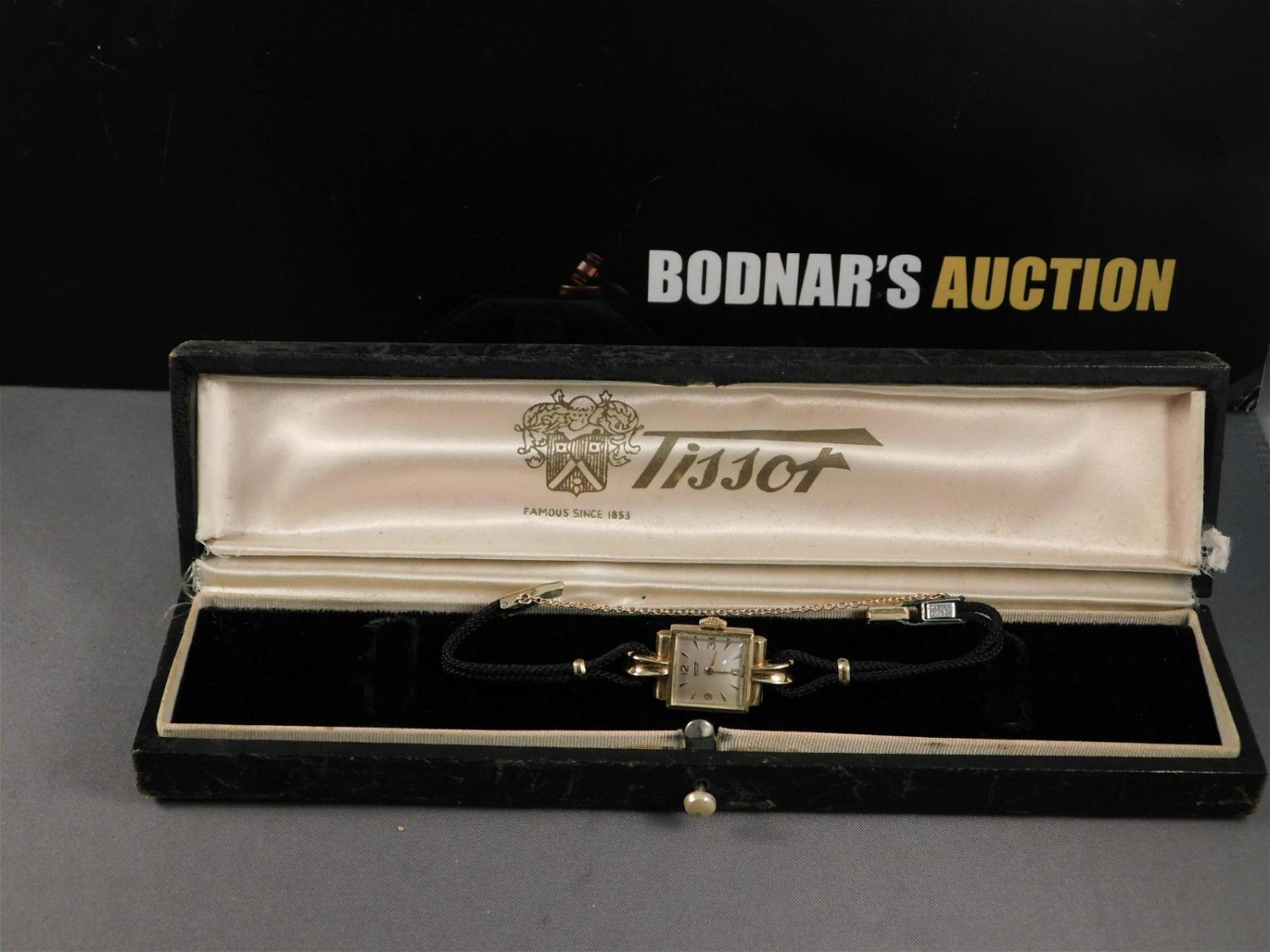 14K vintage Tissot ladies watch with a black rope band. The bezel and case back are 14K and is marked on the inside of the case. The clasps are gold tone. Has original box. Measures approx. 6 1/2". Has a safety chain. All invoices must be paid within 24 hours of the sale. All items are shipped USPS or UPS and will be billed separately. A $12 handling fee is added to the shipping price per lot if shipped in house. Some items or large quantity of purchases will be packed and shipped via the UPS store. Local pickups are at our South Brunswick location on Friday, Saturday and Monday ONLY! All pickups are by appointment only. Any condition issues will be listed in the description. Please read the terms for full information.