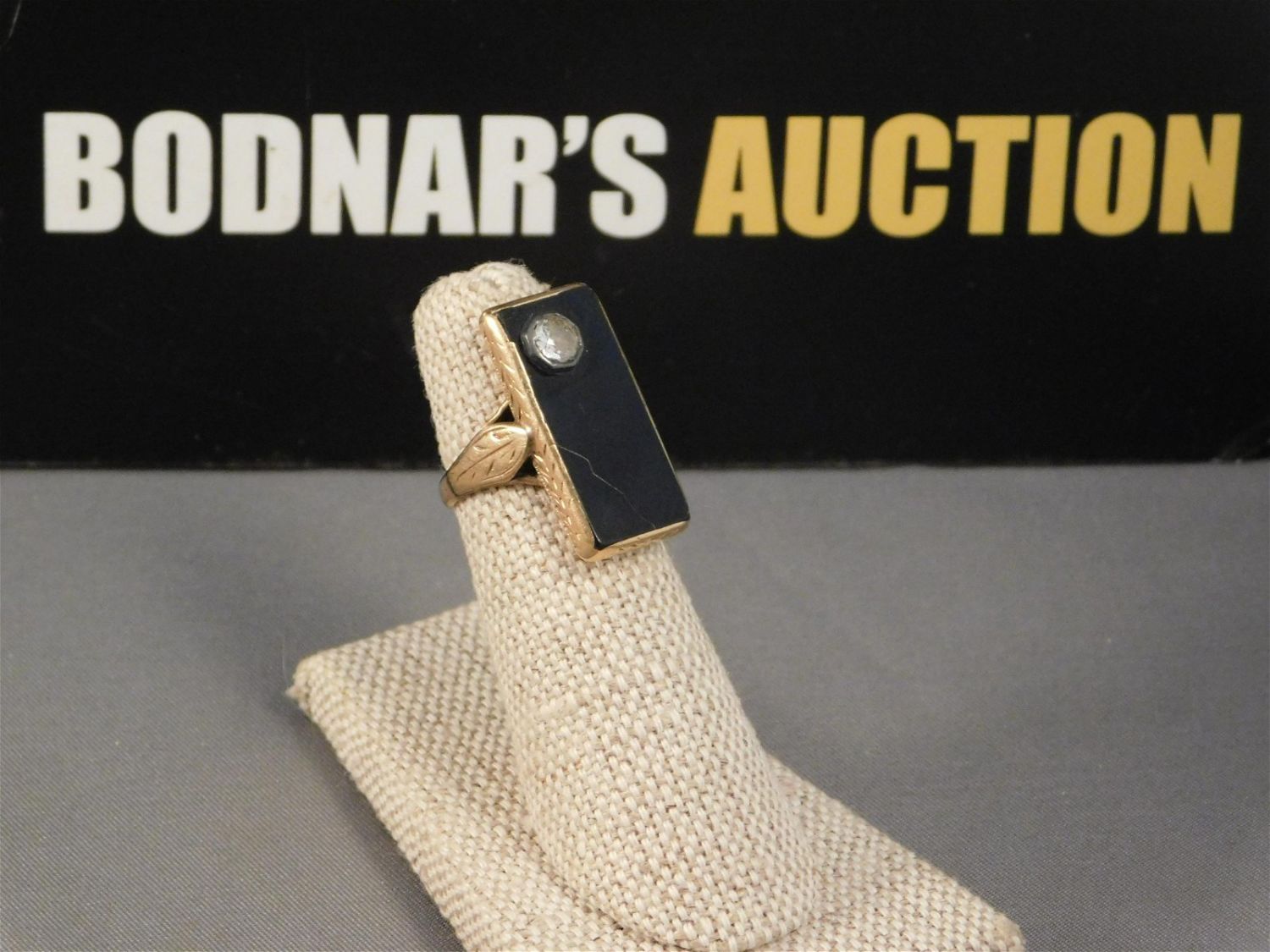 14K, black onyx and diamond ring. Unfortunately, the black onyx has a crack in the bottom left corner. Has a beautiful older cut diamond in the top left. Is marked. Size 4 1/4. All invoices must be paid within 24 hours of the sale. All items are shipped USPS or UPS and will be billed separately. A $12 handling fee is added to the shipping price per lot if shipped in house. Some items or large quantity of purchases will be packed and shipped via the UPS store. Local pickups are at our South Brunswick location on Friday, Saturday and Monday ONLY! All pickups are by appointment only. Any condition issues will be listed in the description. Please read the terms for full information.