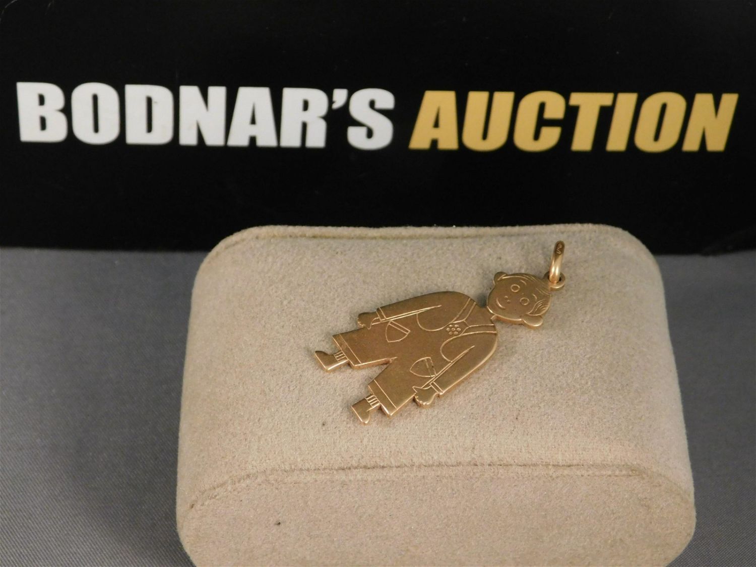 18K yellow gold charm depicting a child in overalls. Is marked. Measures approx. 1 3/4" and weighs approx. 6.7g. All invoices must be paid within 24 hours of the sale. All items are shipped USPS or UPS and will be billed separately. A $12 handling fee is added to the shipping price per lot if shipped in house. Some items or large quantity of purchases will be packed and shipped via the UPS store. Local pickups are at our South Brunswick location on Friday, Saturday and Monday ONLY! All pickups are by appointment only. Any condition issues will be listed in the description. Please read the terms for full information.